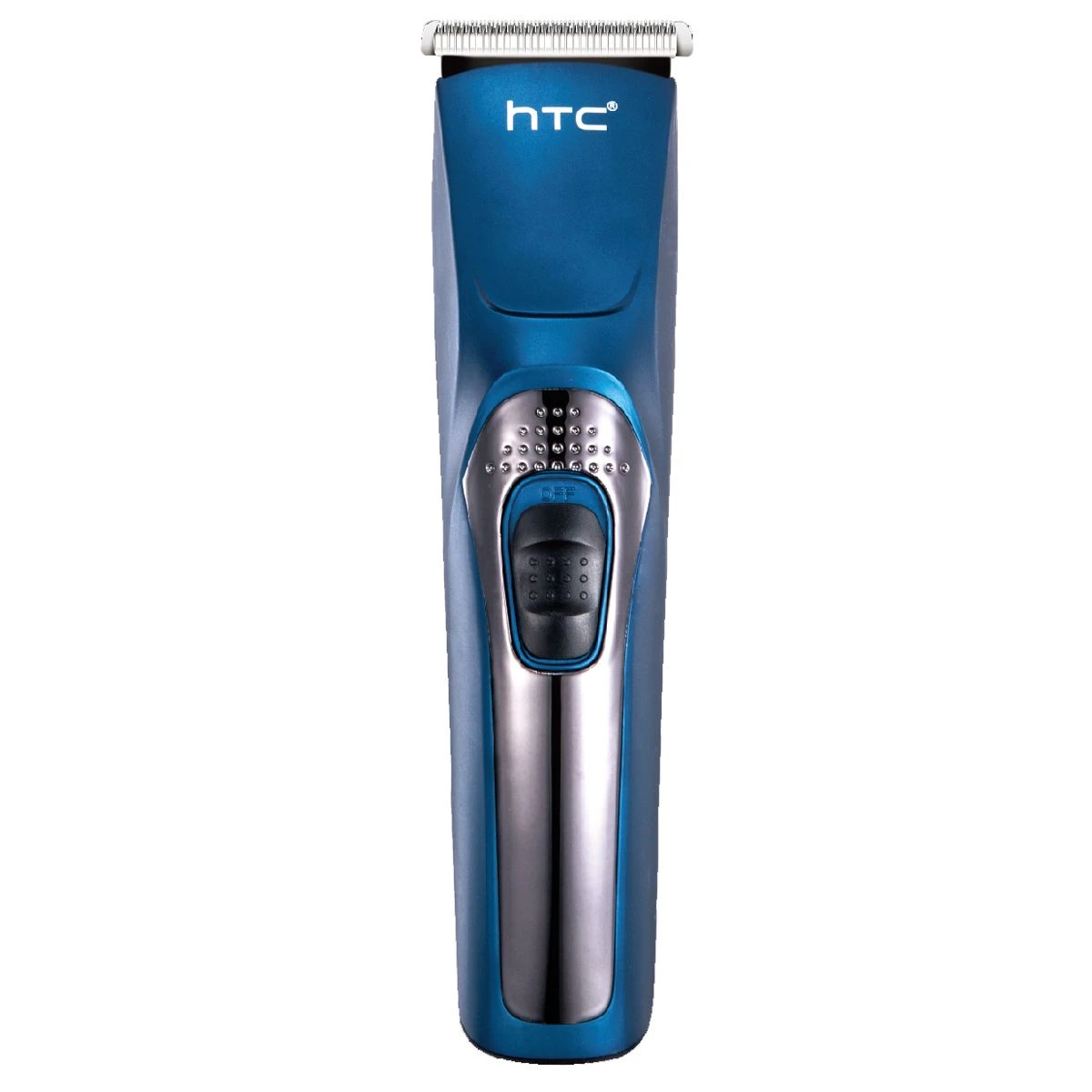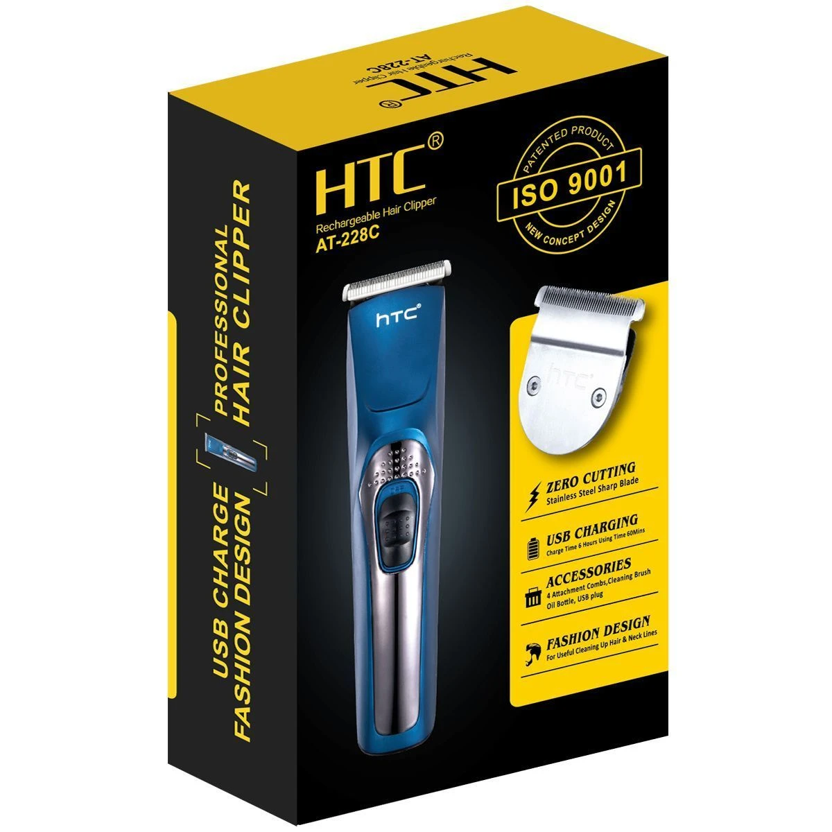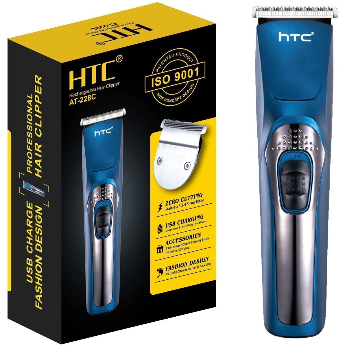 Машинка для стрижки волос HTC AT-228C. Цвет Серебристый/синий, время работы 60 мин, время заряда 6ч., функция стрижки под "0", 4 насадки (3,6,9,12)мм, масло, щеточка, USB.