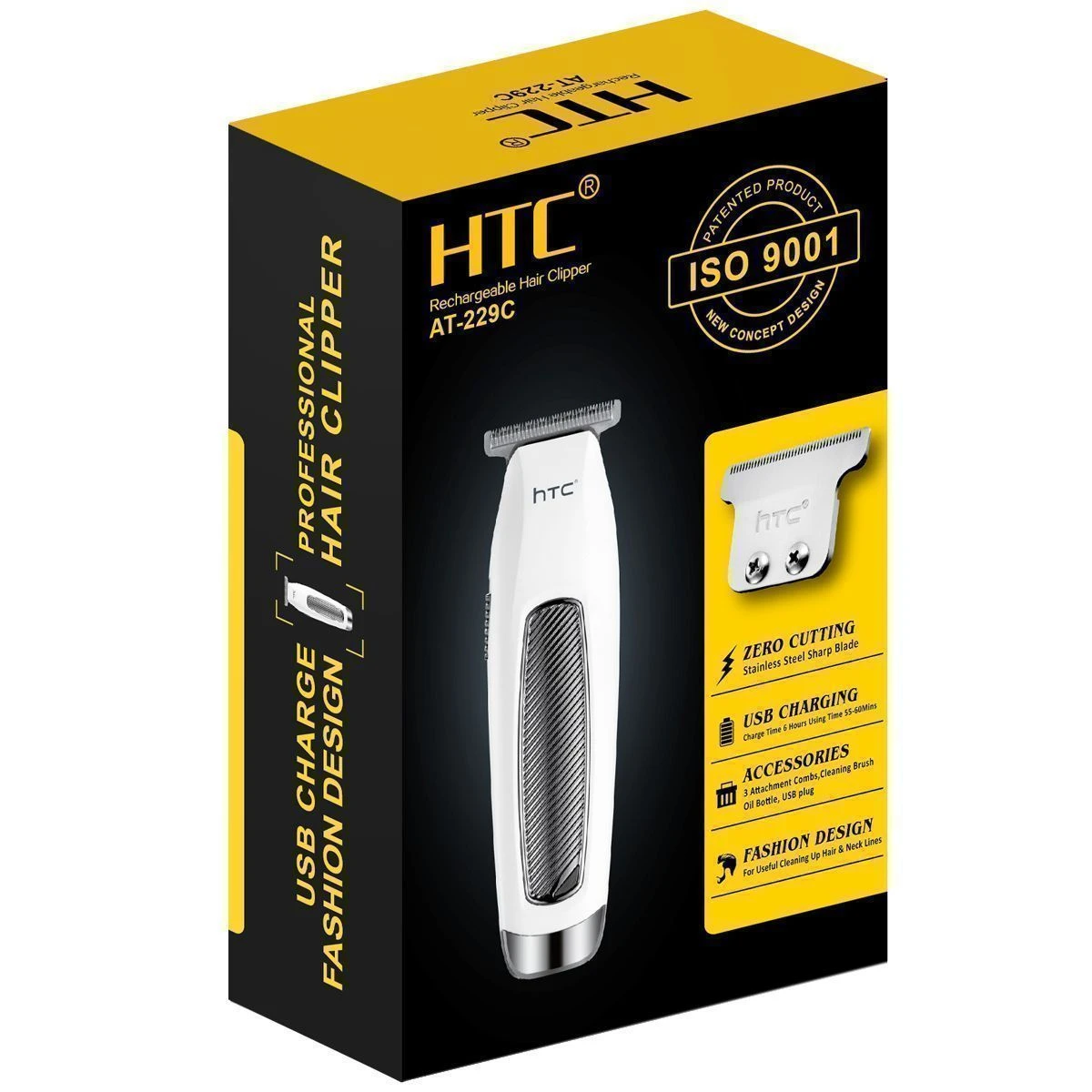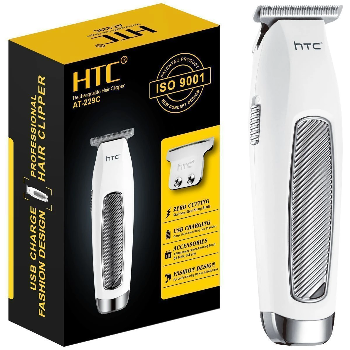 Машинка для стрижки волос HTC AT-229C. Цвет белый/хром, время работы 60 мин, время заряда 6ч., функция стрижки под "0", 3 насадки (1,2,3)мм, масло, щеточка, адаптер/USB, индикатор заряда, защитная крышка.