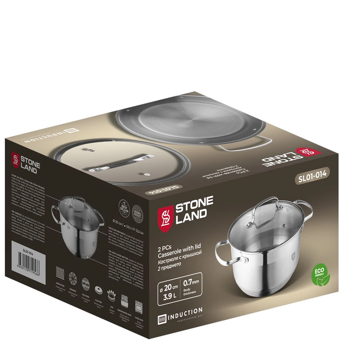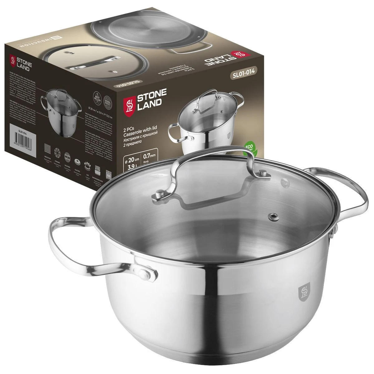 Кастрюля из нержавеющей стали с крышкой STONE LAND SL01-014, Диаметр: 20 см.; Объем: 3,9 л.; Высота: 12,5 см.;