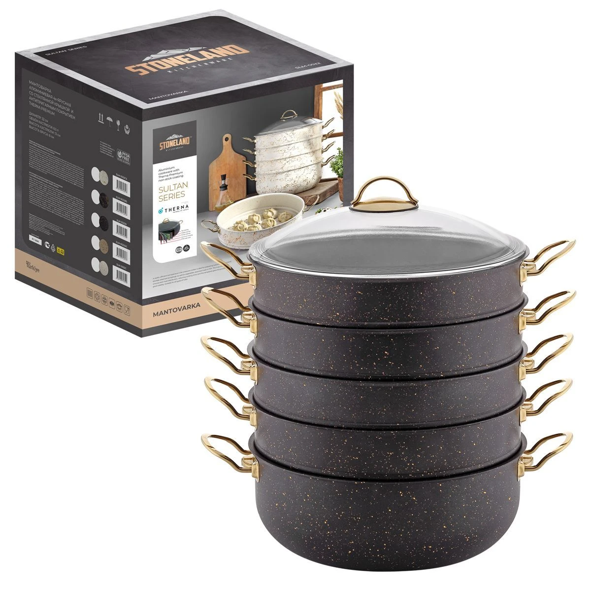 Мантоварка STONELAND SLM-0532B Цвет: Черный Диаметр: 32 Высота: 13/8 Объем: 8,5 Производство: Турция Материал: Кованый алюминий Толщина дна/стенок: 2,5/1,8 мм Подходит: для всех видов плит, включая индукцию. Стеклянная крышка в комлекте.