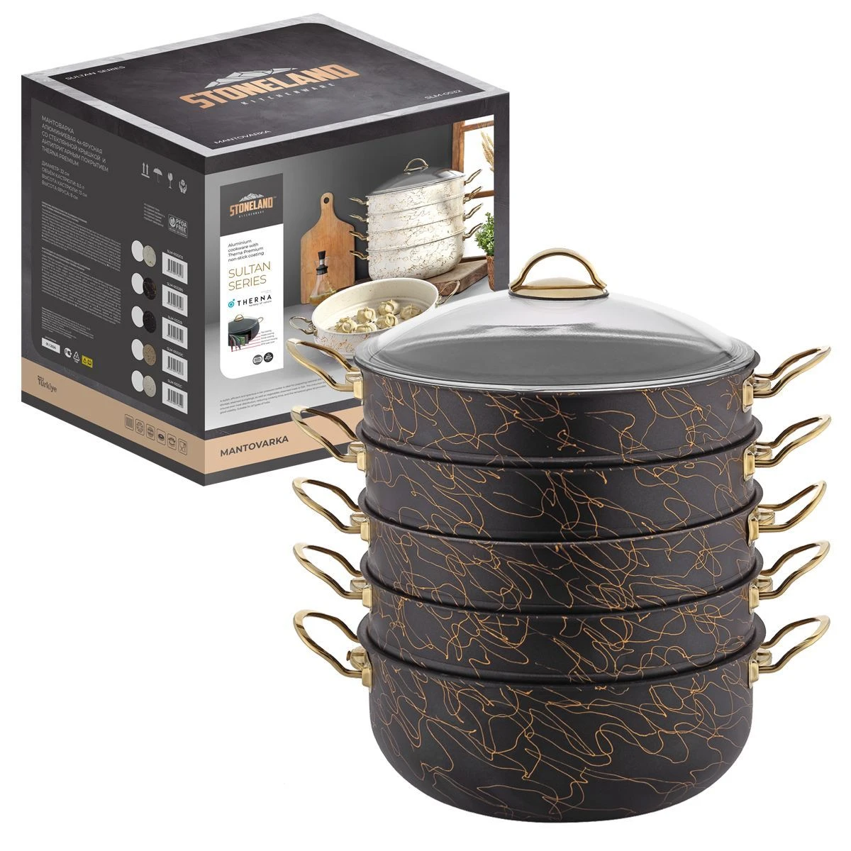 Мантоварка STONELAND SLM-0532BS Цвет: Черный спайдер Диаметр: 32 Высота: 13/8 Объем: 8,5 Производство: Турция Материал: Кованый алюминий Толщина дна/стенок: 2,5/1,8 мм Подходит: для всех видов плит, включая индукцию. Стеклянная крышка в комлекте.