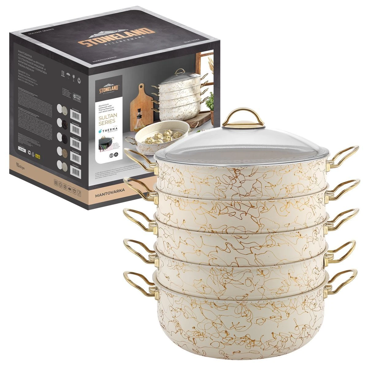 Мантоварка STONELAND SLM-0532CS Цвет: Кремовый спайдер Диаметр: 32 Высота: 13/8 Объем: 8,5 Производство: Турция Материал: Кованый алюминий Толщина дна/стенок: 2,5/1,8 мм Подходит: для всех видов плит, включая индукцию. Стеклянная крышка в комлекте.
