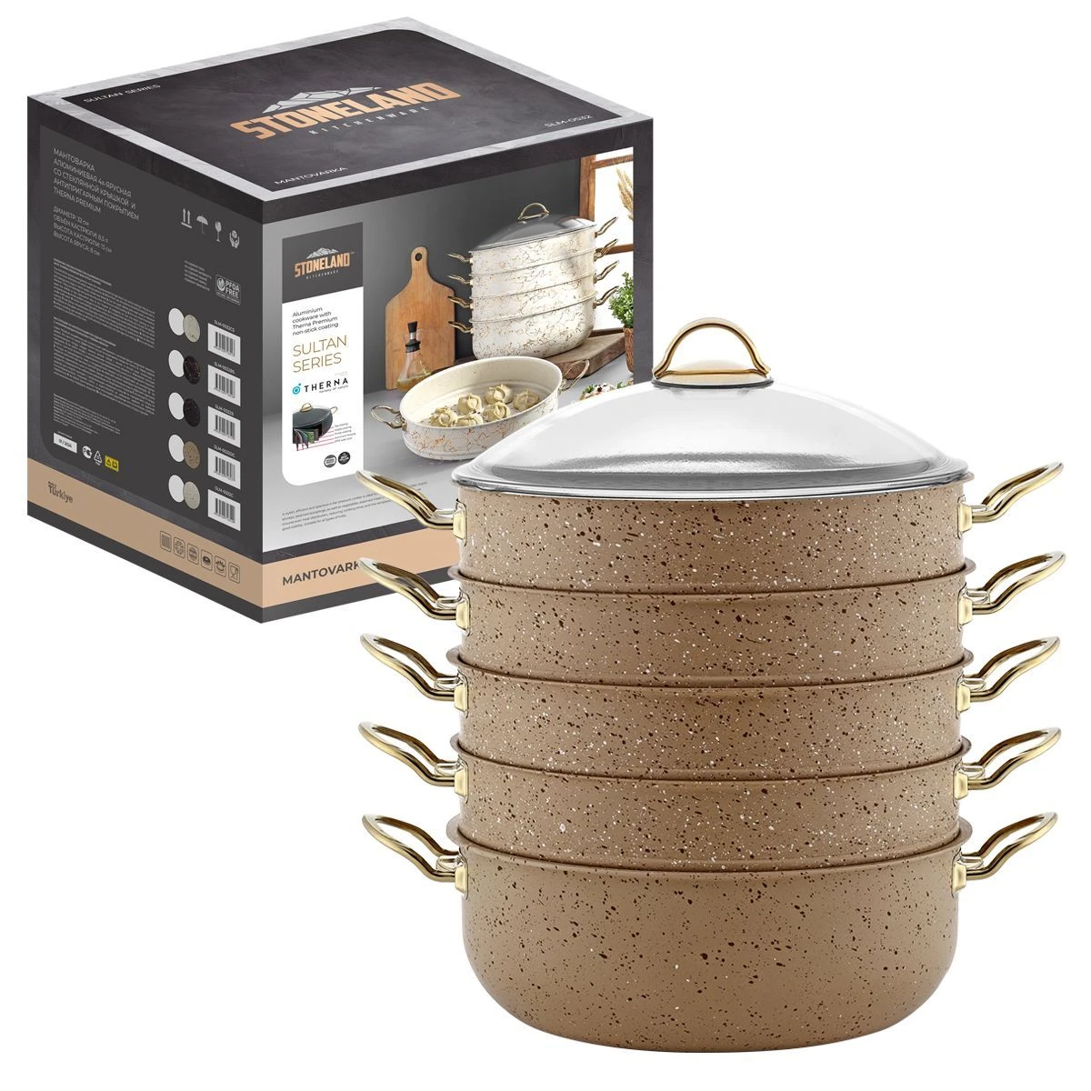 Мантоварка STONELAND SLM-0532DC Цвет: Темный капучино Диаметр: 32 Высота: 13/8 Объем: 8,5 Производство: Турция Материал: Кованый алюминий Толщина дна/стенок: 2,5/1,8 мм Подходит: для всех видов плит, включая индукцию. Стеклянная крышка в комлекте.