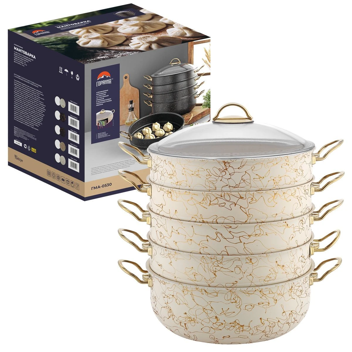 Мантоварка Горянка ГМА-0530КС Цвет: Кремовый спайдер Диаметр: 30 Высота: 13/8 Объем: 7,5 Производство: Турция Материал: Кованый алюминий Толщина дна/стенок: 2,5/1,8 мм Подходит: для всех видов плит, включая индукцию. Стеклянная крышка в комлекте.