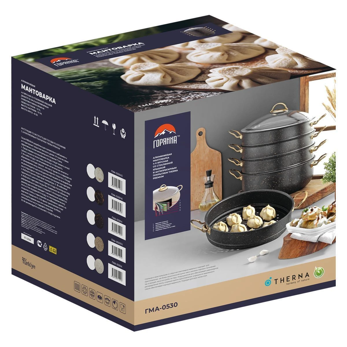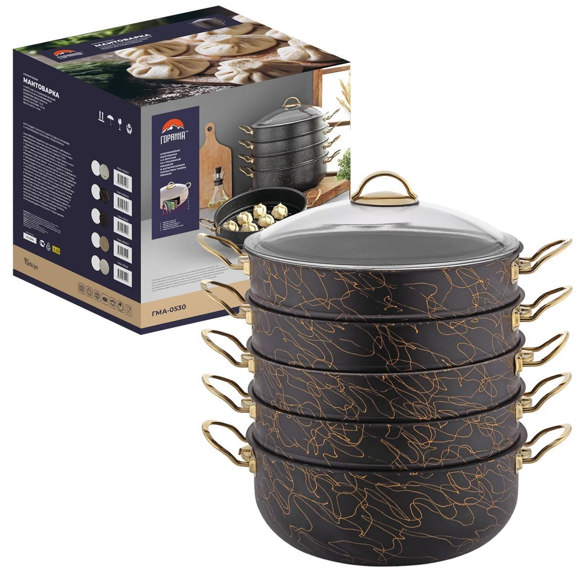 Мантоварка Горянка ГМА-0530ЧС Цвет: Черный спайдер Диаметр: 30 Высота: 13/8 Объем: 7,5 Производство: Турция Материал: Кованый алюминий Толщина дна/стенок: 2,5/1,8 мм Подходит: для всех видов плит, включая индукцию. Стеклянная крышка в комлекте.