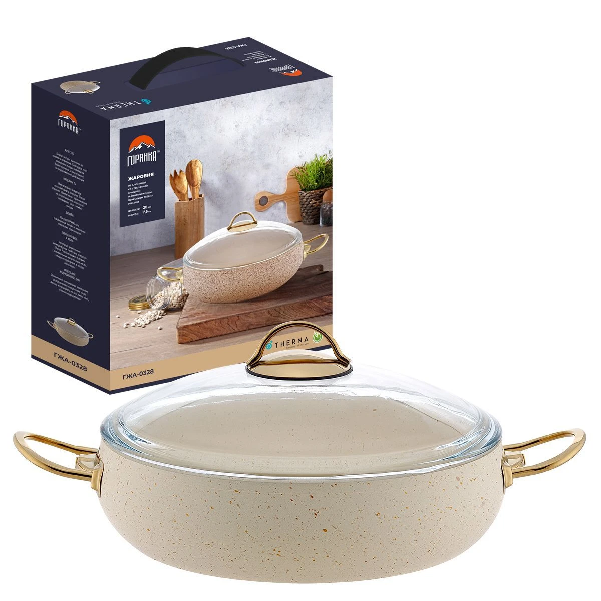 Цвет: Кремовый; Диаметр: 28; Высота: 7,5 ; Объем: 3,5; Производство: Турция. Материал: Кованый алюминий. Толщина дна/стенок: 4мм; Пятислойное индукционное капсульное дно.