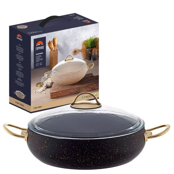 Цвет: Черный; Диаметр: 24; Высота: 6,5; Объем: 2,5; Производство: Турция. Материал: Кованый алюминий. Толщина дна/стенок: 4мм; Пятислойное индукционное капсульное дно.
