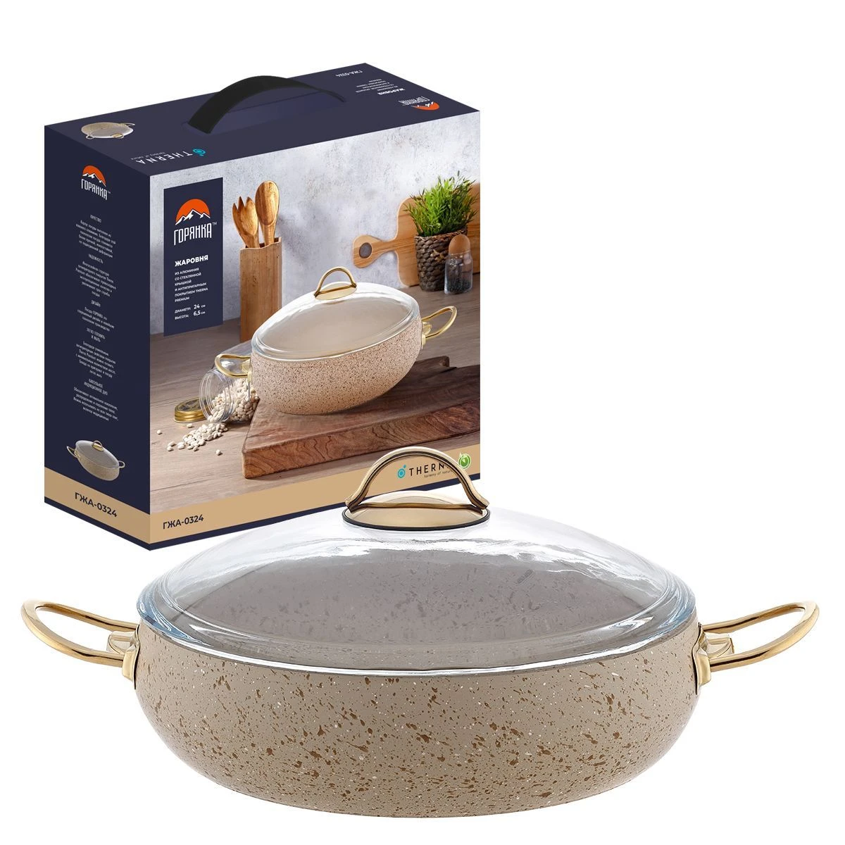 Цвет: Темный капучино; Диаметр: 24; Высота: 6,5; Объем: 2,5; Производство: Турция. Материал: Кованый алюминий. Толщина дна/стенок: 4мм; Пятислойное индукционное капсульное дно.