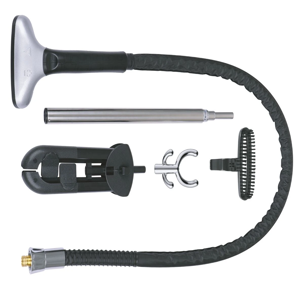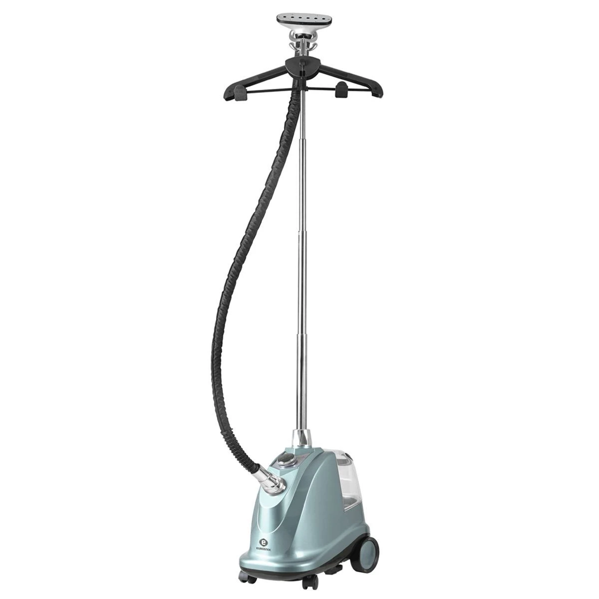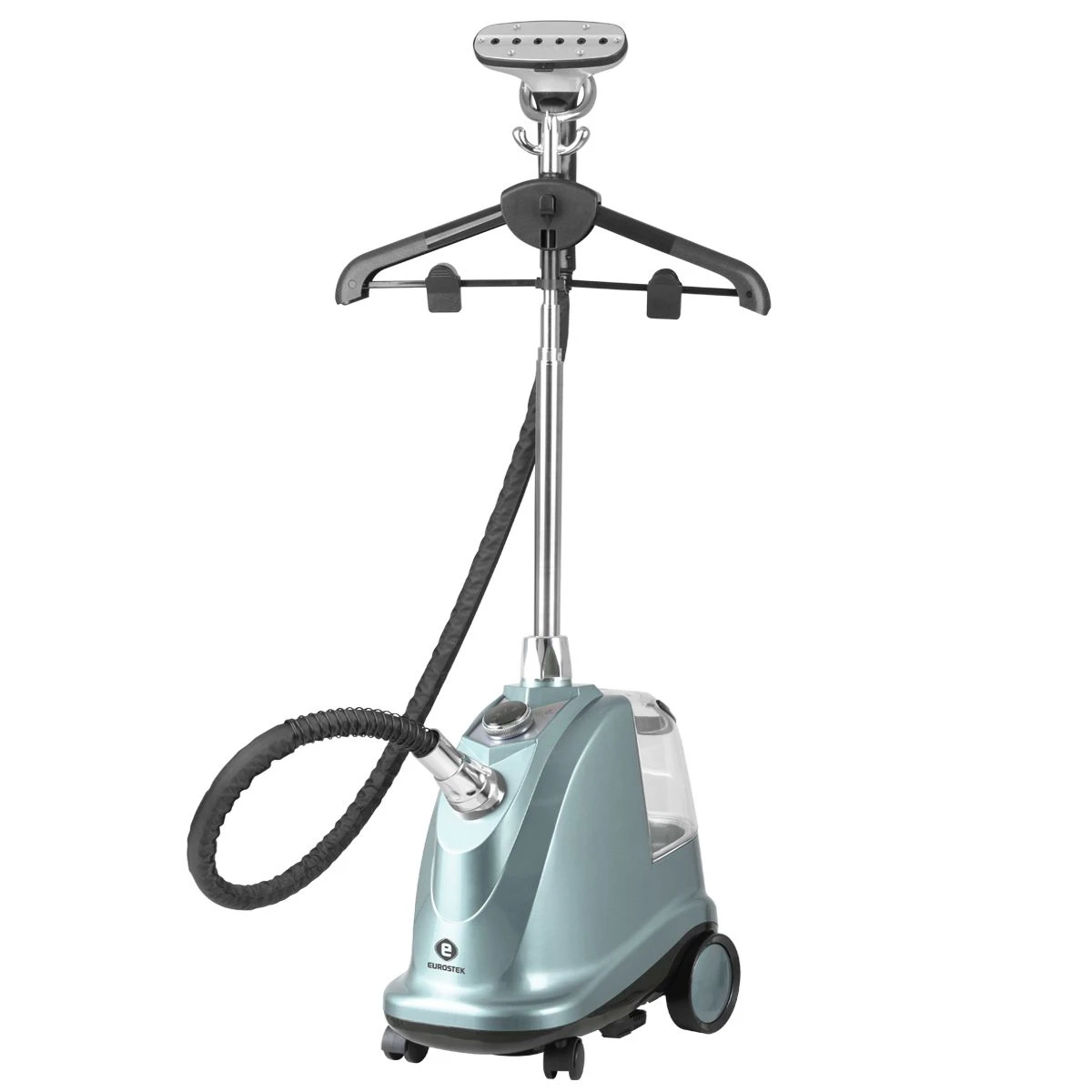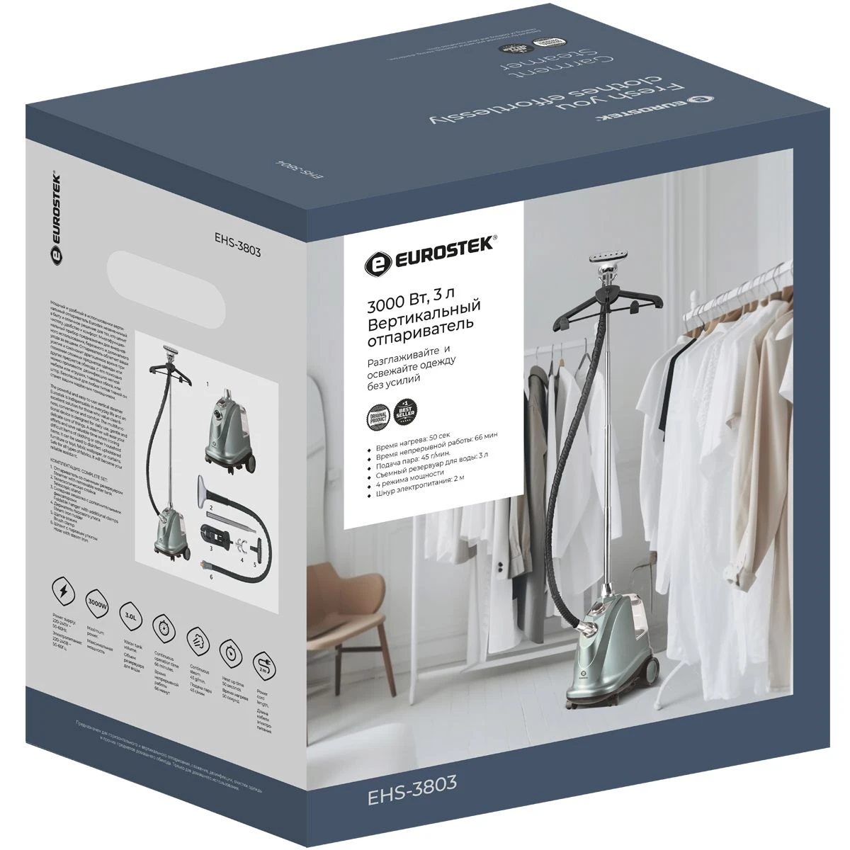 Отпариватель для горизонтального и вертикального отпаривания, Время нагрева 50 сек, Подача пара 45 г/мин. Время безперебойной работы 66 мин, 4 режима мощности. Резервуар 3л. Телескопическая стойка от 0,47 до 1,75 м, Складная вешалка с дополнительными фиксаторами, держатель парового утюжка, щетка зажим, шланг с паровым утюжком, на дне место для хранения шнура электропитания