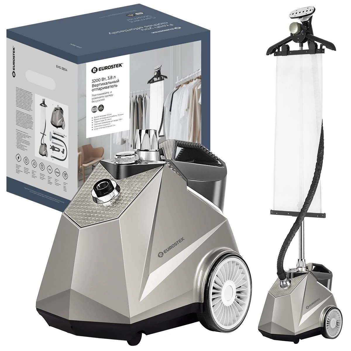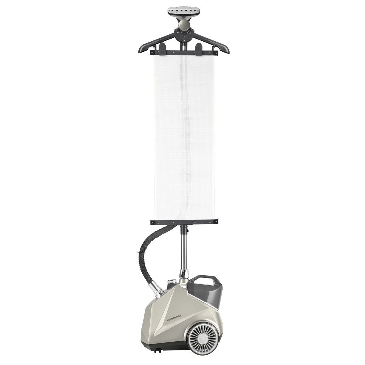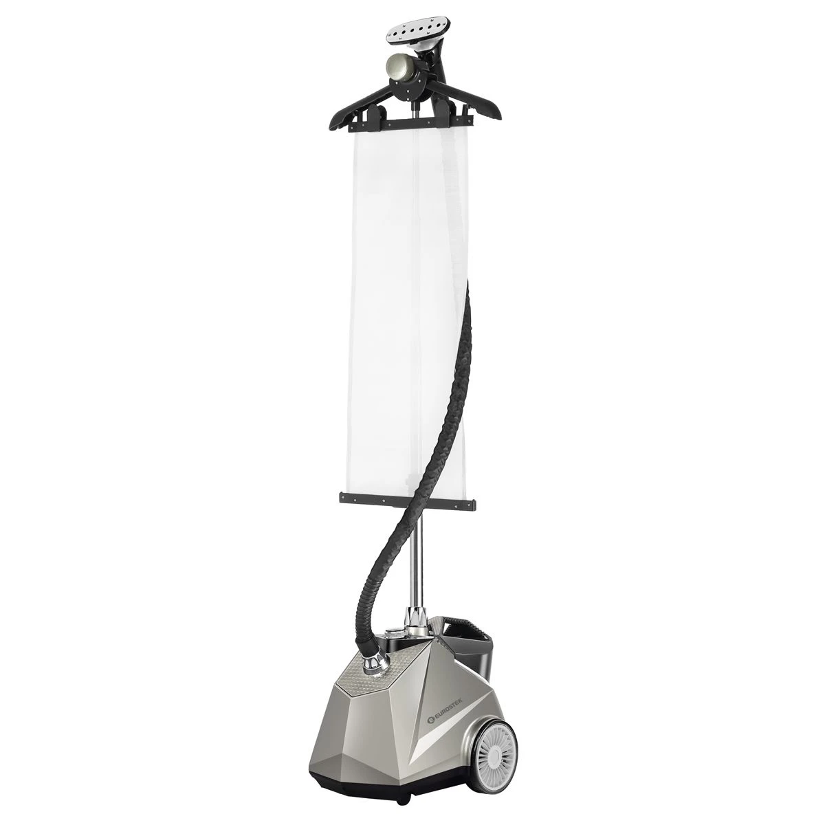 Отпариватель для горизонтального и вертикального отпаривания, Время нагрева 50 сек, Подача пара 55 г/мин. Время безперебойной работы 70 мин.Резервуар 3,8 л. Телескопическая стойка от 47см до 1,75м, Складная вешалка с дополнительными фиксаторами, держатель парового утюжка, щетка зажим, шланг с паровым утюжком, на дне место для хранения шнура электропитания