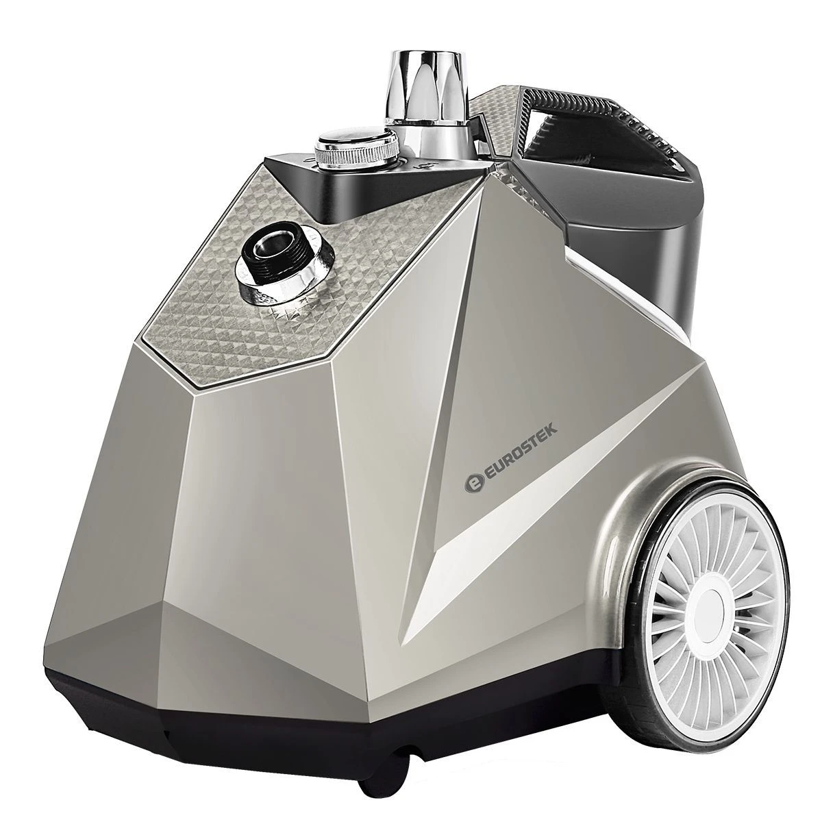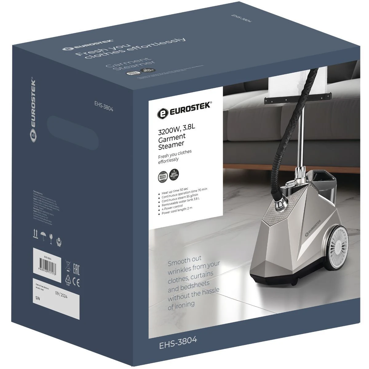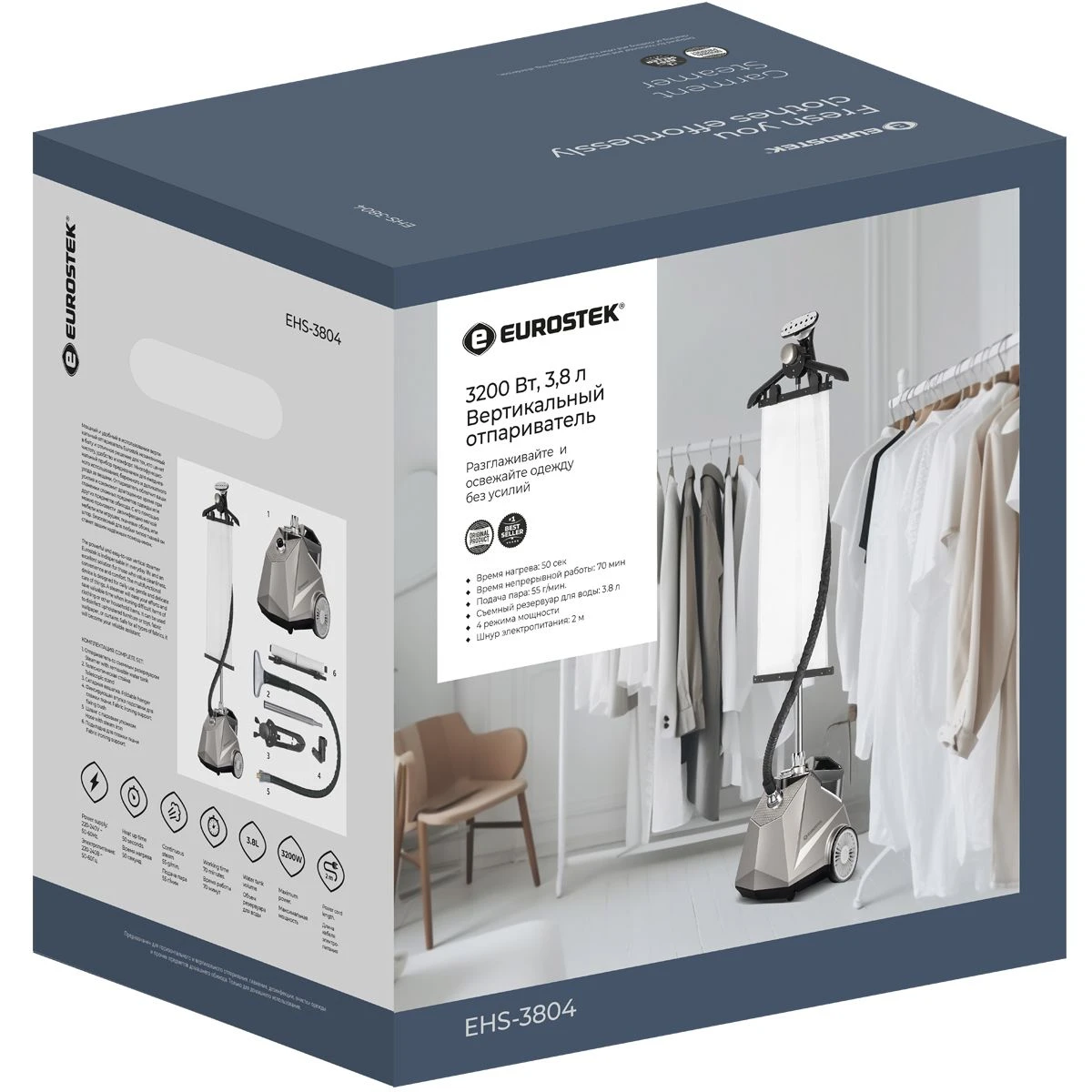 Отпариватель для горизонтального и вертикального отпаривания, Время нагрева 50 сек, Подача пара 55 г/мин. Время безперебойной работы 70 мин.Резервуар 3,8 л. Телескопическая стойка от 47см до 1,75м, Складная вешалка с дополнительными фиксаторами, держатель парового утюжка, щетка зажим, шланг с паровым утюжком, на дне место для хранения шнура электропитания