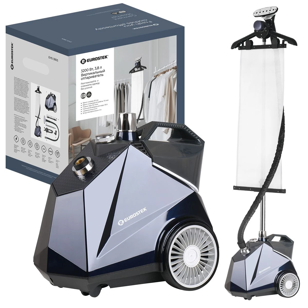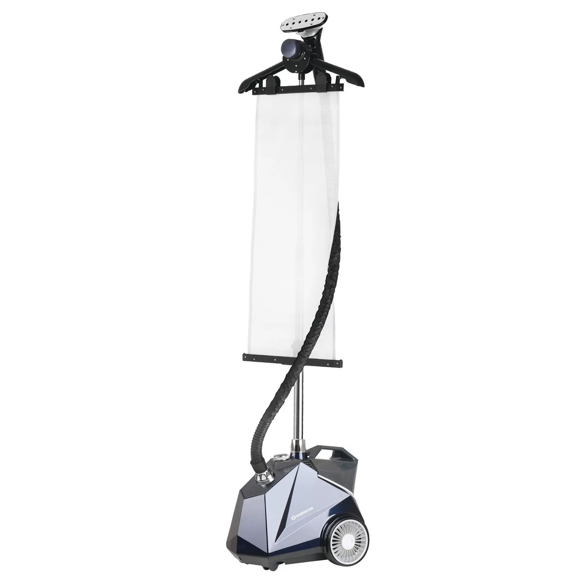 Отпариватель для горизонтального и вертикального отпаривания, Время нагрева 50 сек, Подача пара 55 г/мин. Время безперебойной работы 70 мин. Резервуар 3,8 л. Телескопическая стойка от 47см до 1,75м, Складная вешалка с дополнительными фиксаторами, держатель парового утюжка, щетка зажим, шланг с паровым утюжком, на дне место для хранения шнура электропитания