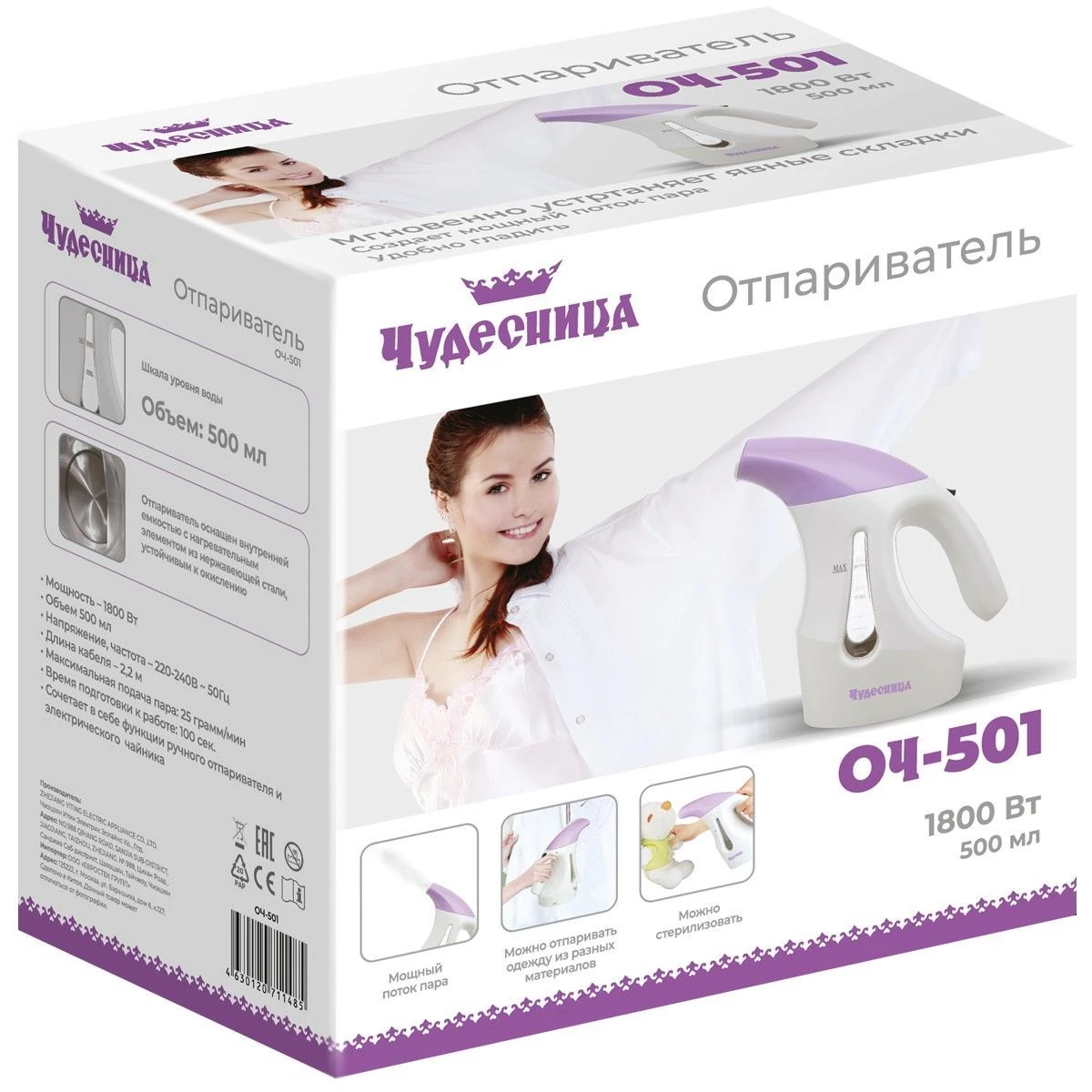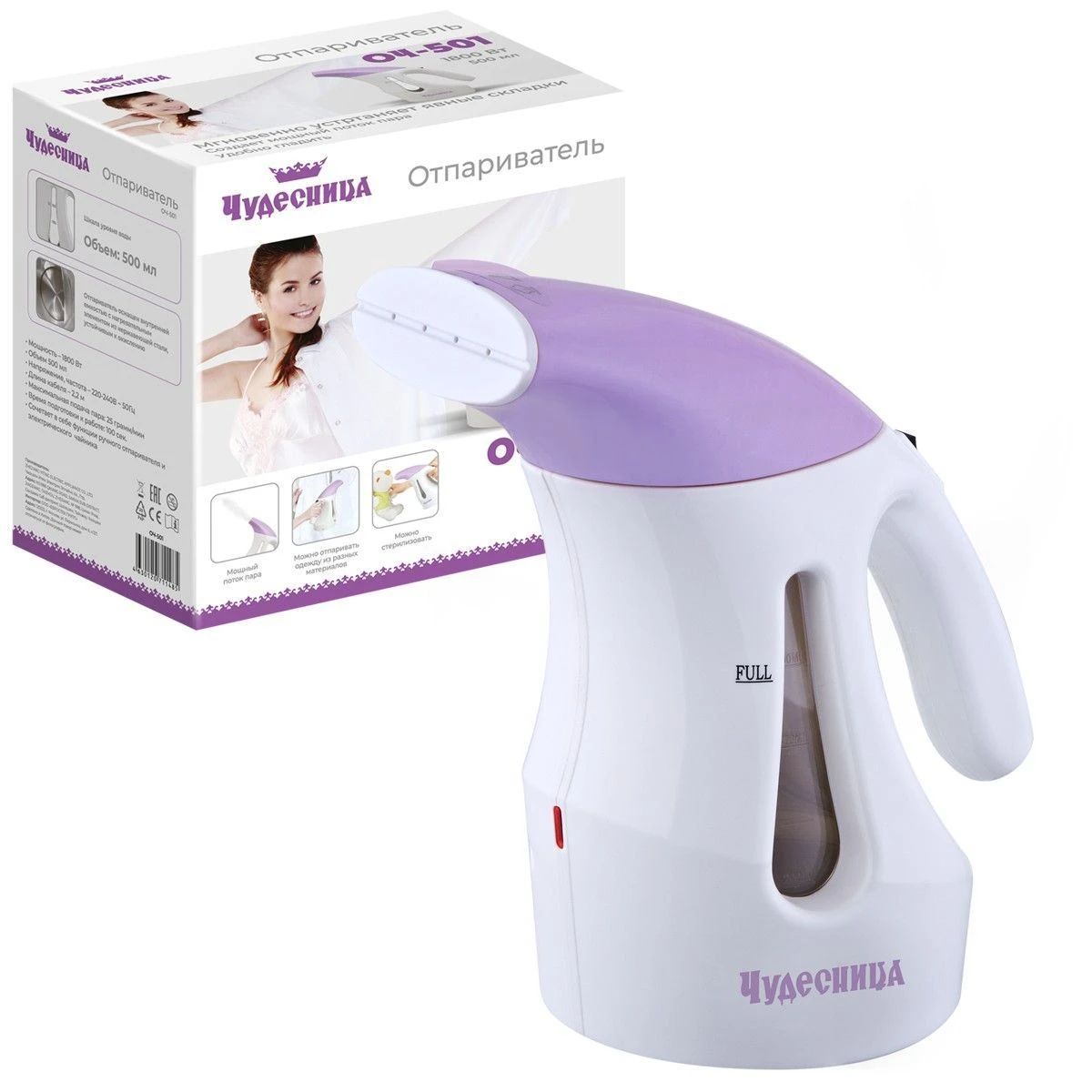 Отпариватель ОЧ-501, объемом 0,5 л., мощность 1800 Вт., подача пара 25 гр/мин, время подготовки 100 сек., Возможность отпаривать одежду из разных материалов и стерилизовать мягкую мебель и игрушки