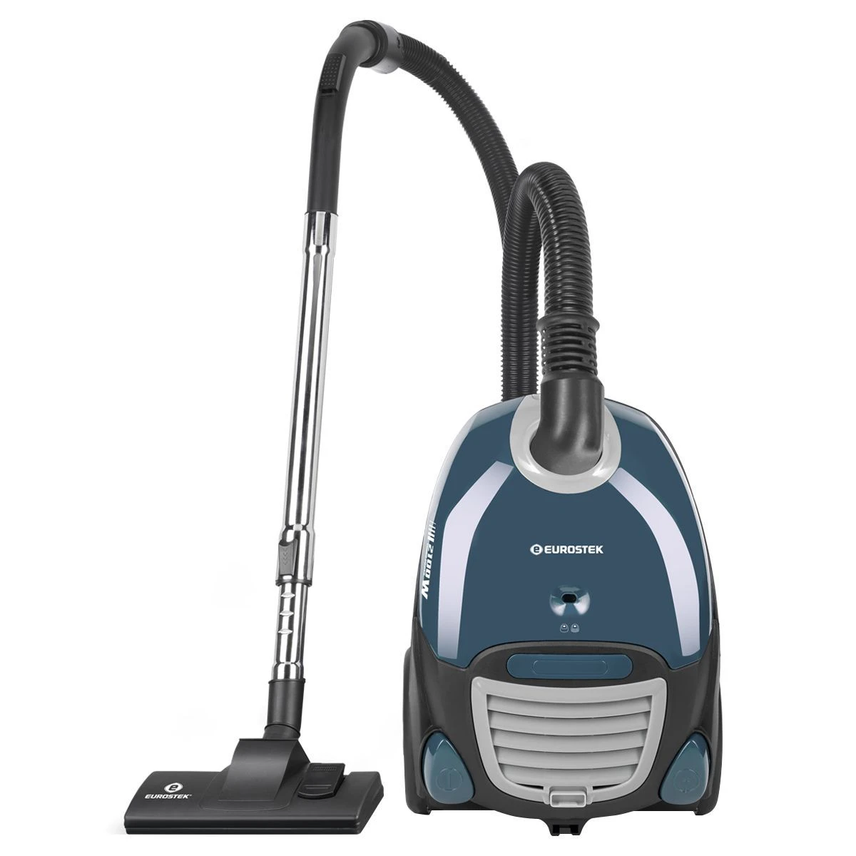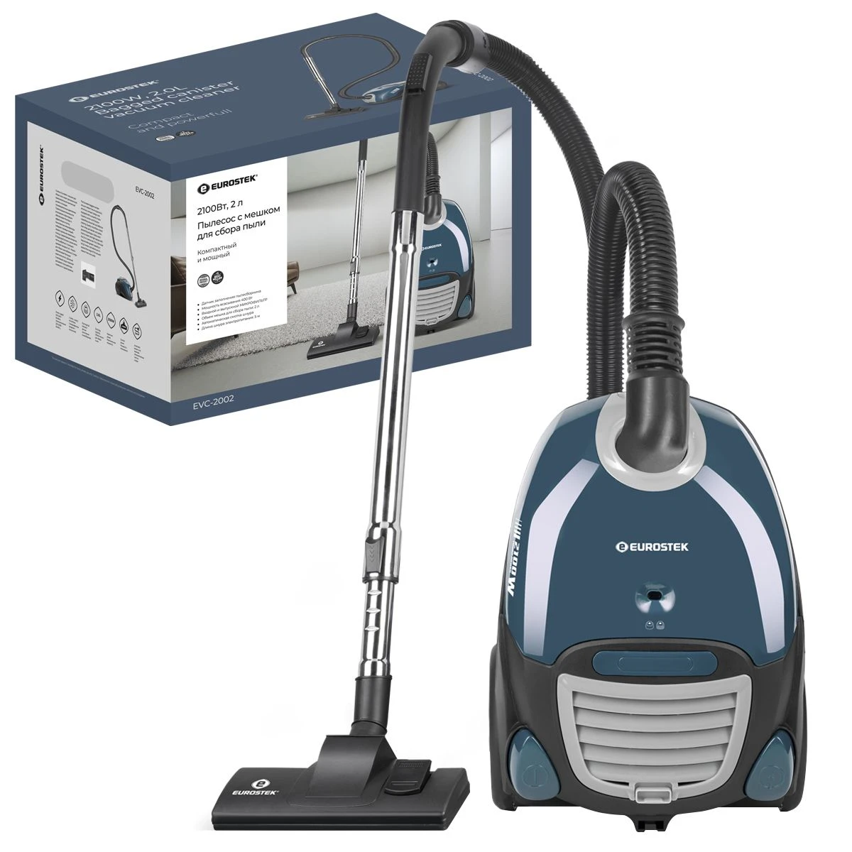 Пылесос с тканевым пылесборником Eurostek EVC-2002 Максимальная мощность 2100 Вт., мощность всасывания 400 Вт., телескопическая металлическая трубка и щетка для пола, объем пылесборника составляет 2 литра, защита от перегрева, автоматическая смотка шнура.
