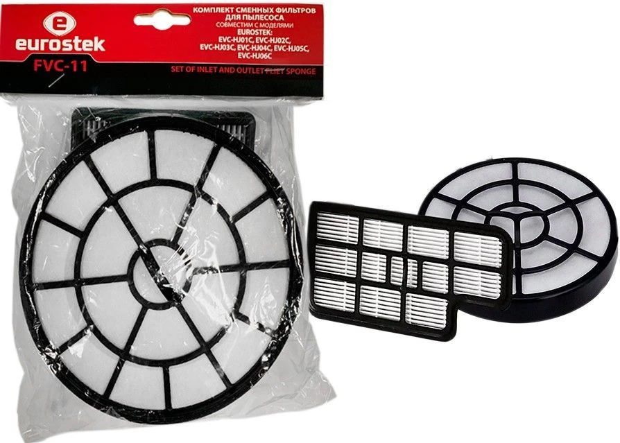 Комплект сменных фильтров для пылесоса Eurostek FVC-11. Совместим с моделями Eurostek: EVC-HJ01C, EVC-HJ02C, EVC-HJ03C, EVC-HJ04C, EVC-HJ05C, EVC-HJ06C. 2 внутренних губчатый фильтр. Внешний Хепа фильтр
