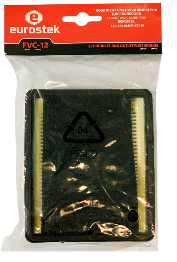 Комплект сменных фильтров для пылесоса Eurostek FVC-12. Совместим с моделями Eurostek: EVC-KP01B, EVC-KP02B. Внутренний губчатый фильтр. Внешний Хепа фильтр