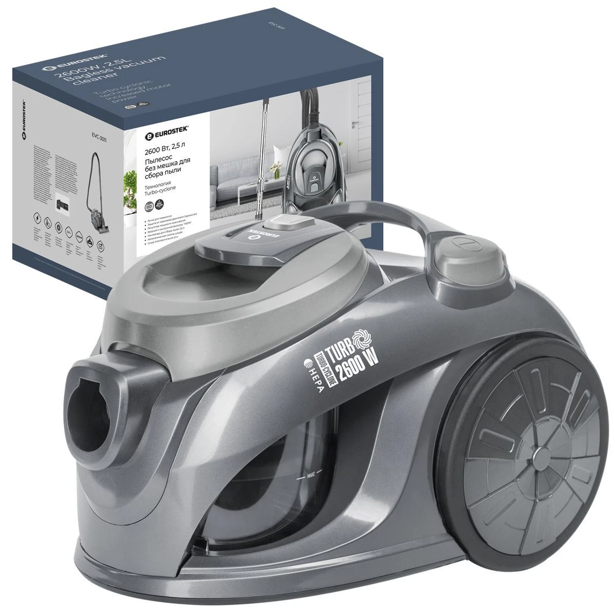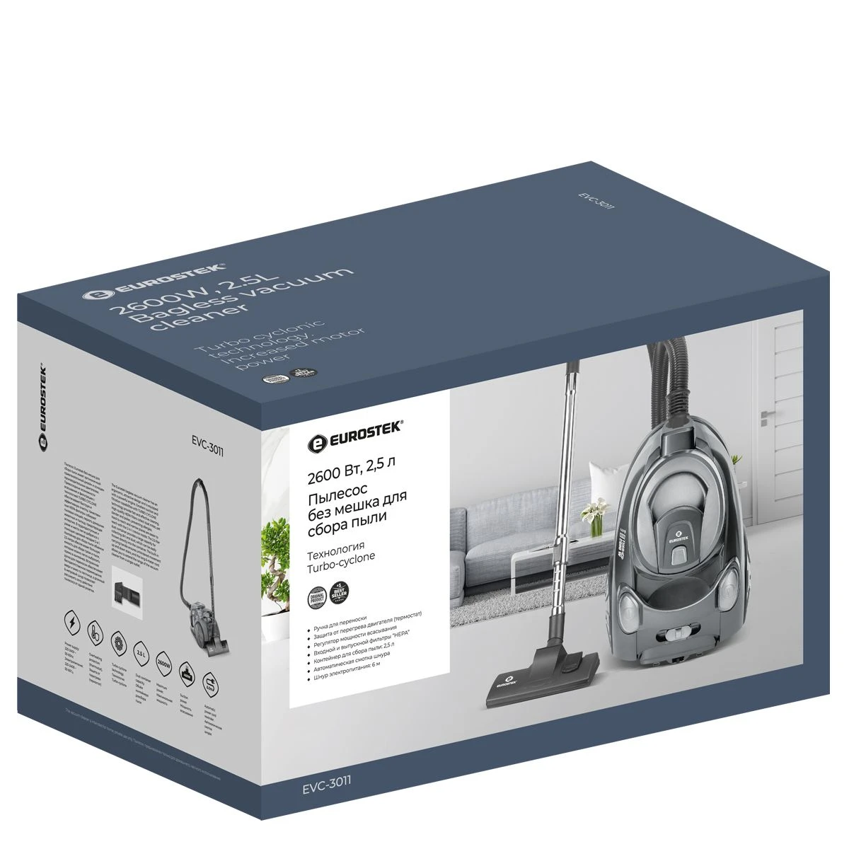 Пылесос электрический Eurostek EVC-3011 обладает мощностью в 2600 Вт., мощность всасывания составляет 450 Вт. Пылесос с многоступенчатой системой фильтрации и объемом пылесборника в 2,5 л. Шнур сматывается автоматически.