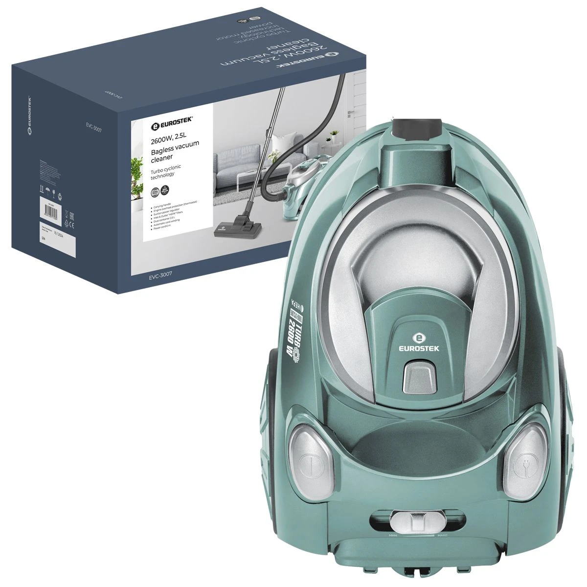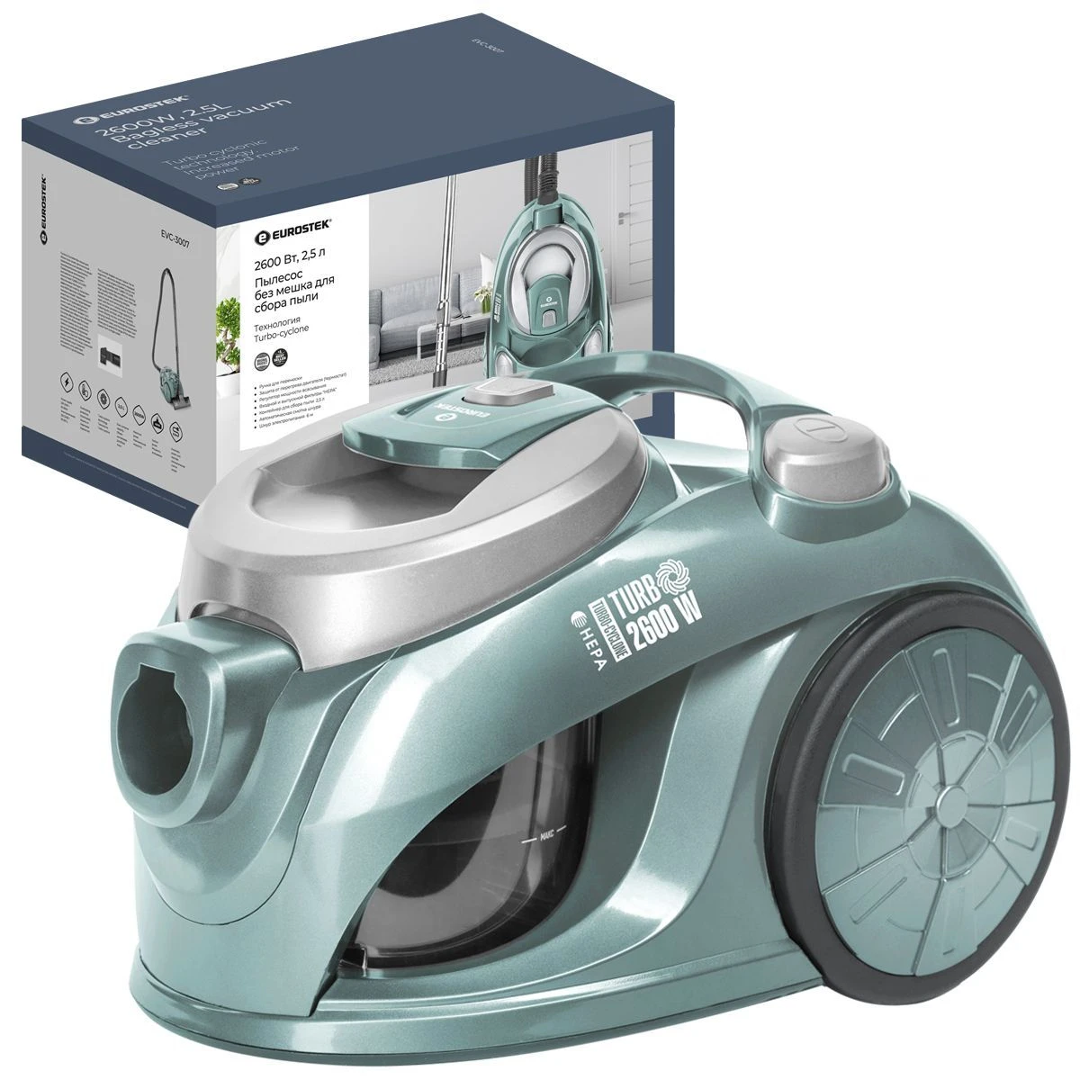 Пылесос без мешка МУЛЬТИ-Циклон Eurostek EVC-3007 с HEPA фильтром. Максимальная мощность 2600 Вт., мощность всасывания 450 Вт., технология МУЛЬТИ-ЦИКЛОН, телескопическая металлическая трубка и щетка для пола, объем пылесборника 2,5 литра, защита от перегрева, автоматическая смотка шнура.