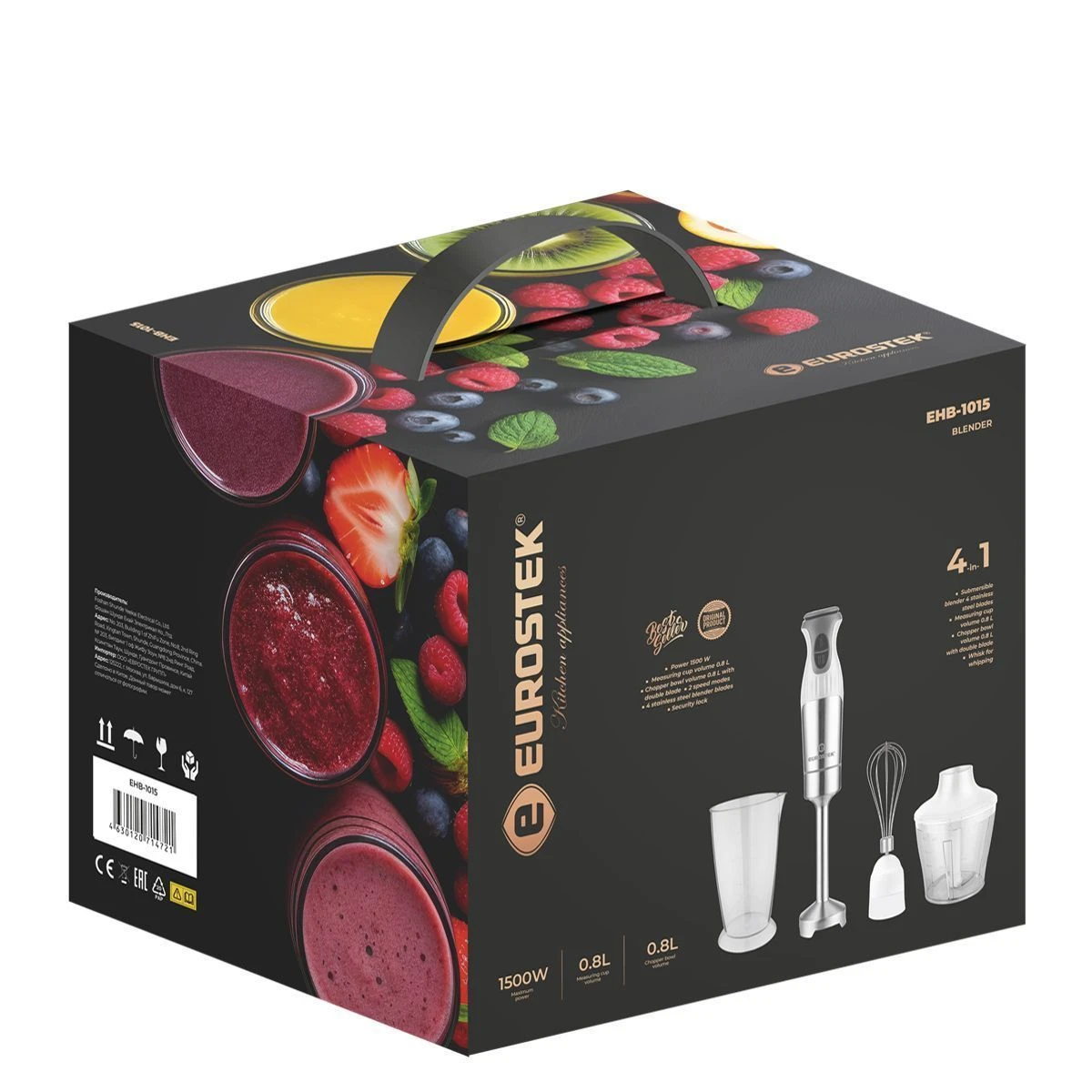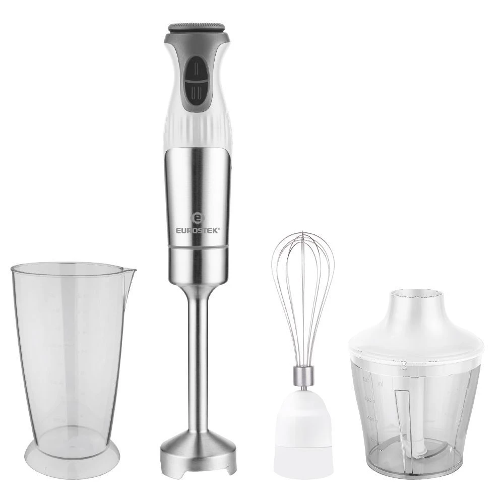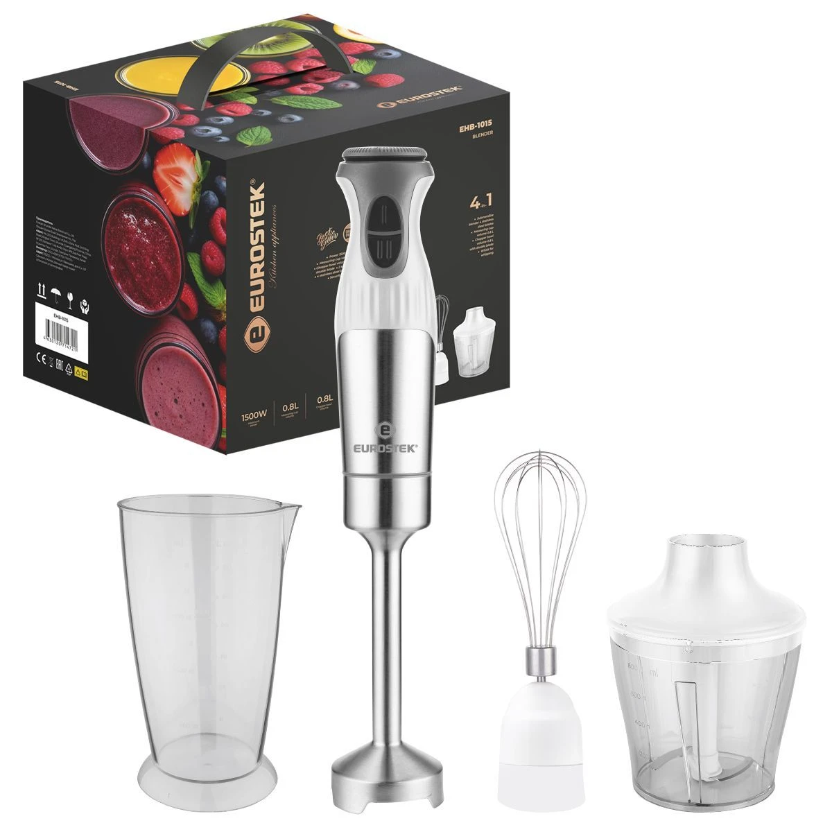 Блендер погружной EHB-1015. Мощность 1500 Вт, низкий уровень шума, 2 скорости, стальной нож, мерный стакан - 800мл, стальной венчик, измельчитель - 800мл