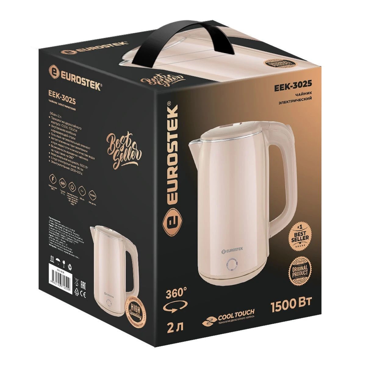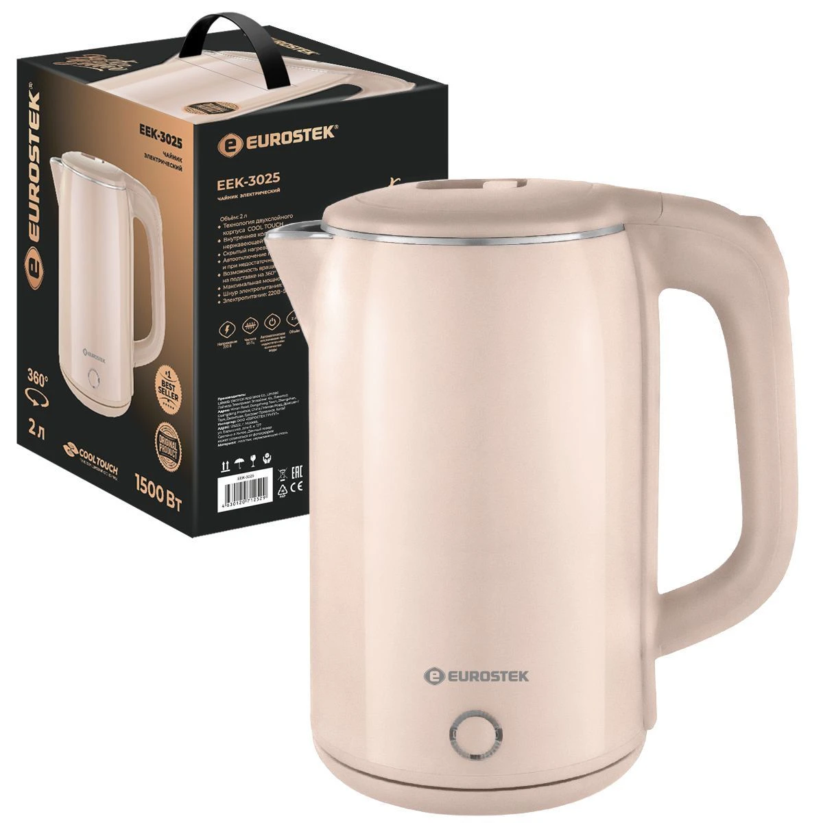 Чайник электрический «Eurostek» EEK-3025, 1500 Вт, Объем 2,0 л , Двойной корпус из нержавеющей стали и пластика, кнопка открывания крышки, шкала уровня воды, дисковый нагревательный элемент, световая индикация работы, вращения чайника на подставке на 360, автоматическое отключение при закипании и при недостаточном количестве воды.