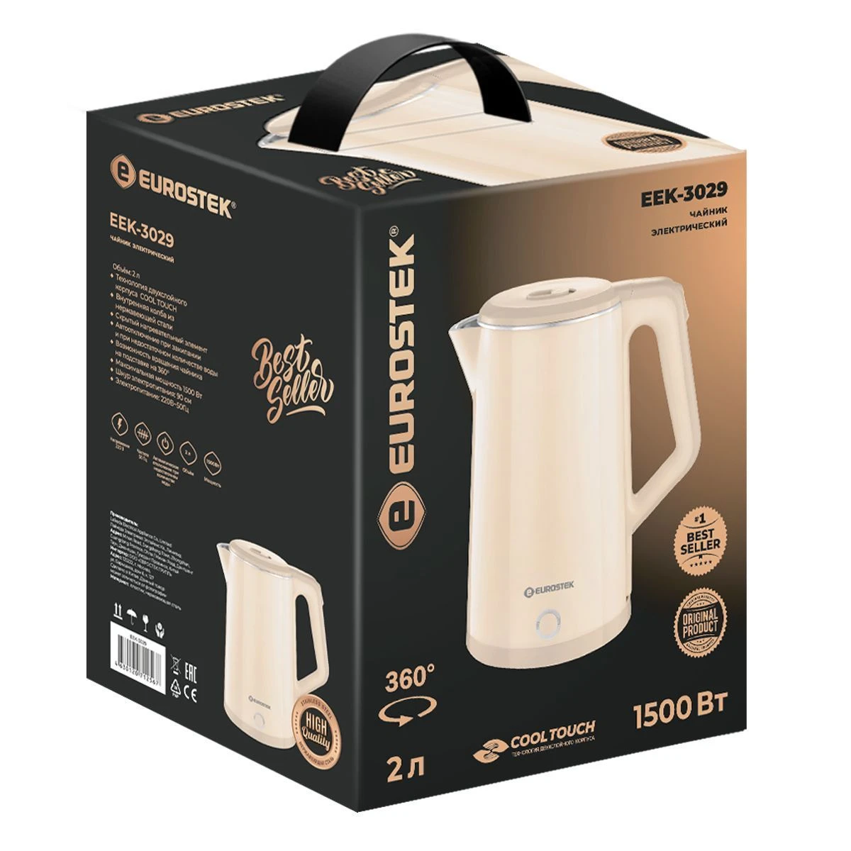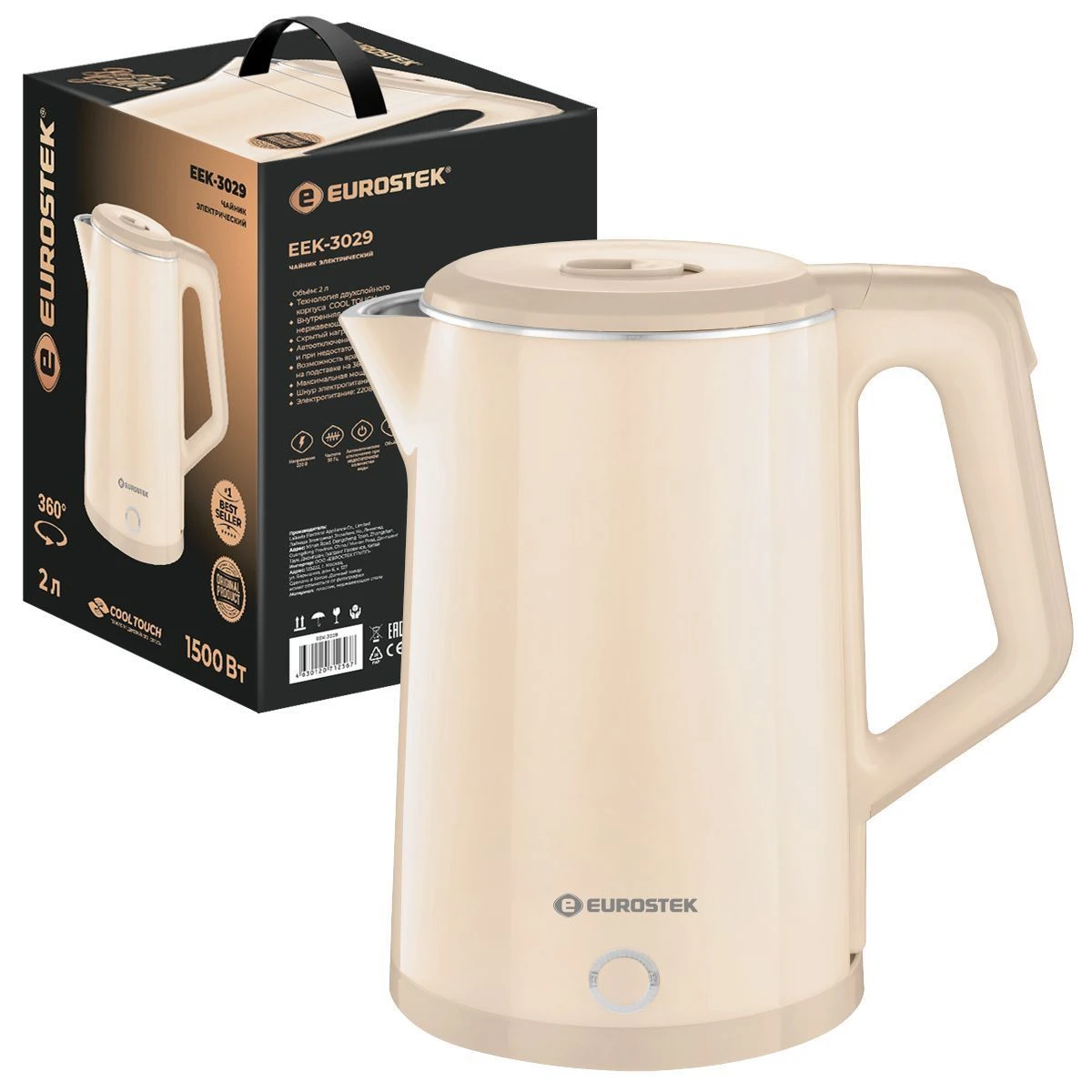 Чайник электрический «Eurostek» EEK-3029, 1500 Вт, Объем 2,0 л , Двойной корпус из нержавеющей стали и пластика, кнопка открывания крышки, шкала уровня воды, дисковый нагревательный элемент, световая индикация работы, вращения чайника на подставке на 360, автоматическое отключение при закипании и при недостаточном количестве воды.