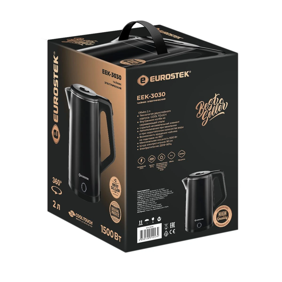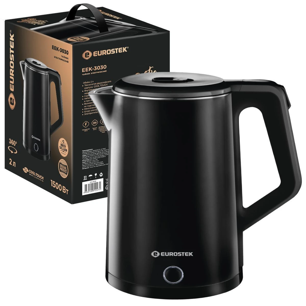 Чайник электрический «Eurostek» EEK-3030, 1500 Вт, Объем 2,0 л , Двойной корпус из нержавеющей стали и пластика, кнопка открывания крышки, шкала уровня воды, дисковый нагревательный элемент, световая индикация работы, вращения чайника на подставке на 360, автоматическое отключение при закипании и при недостаточном количестве воды.