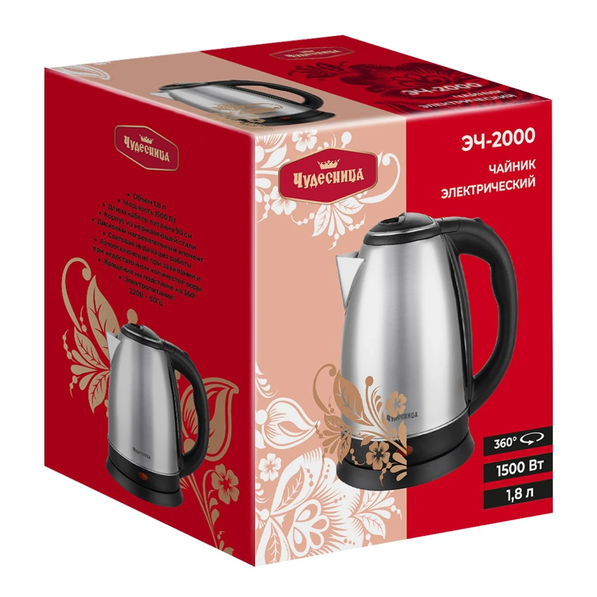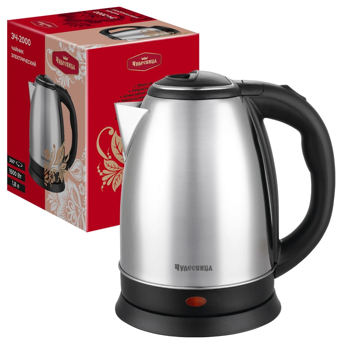 Чайник электрический «Чудесница» ЭЧ-2000, 1500 Вт, Объем 1.8 л , Корпус из нержавеющей стали, кнопка открывания крышки, шкала уровня воды, дисковый нагревательный элемент, световая индикация работы, вращения чайника на подставке на 360, автоматическое отключение при закипании и при недостаточном количестве воды.