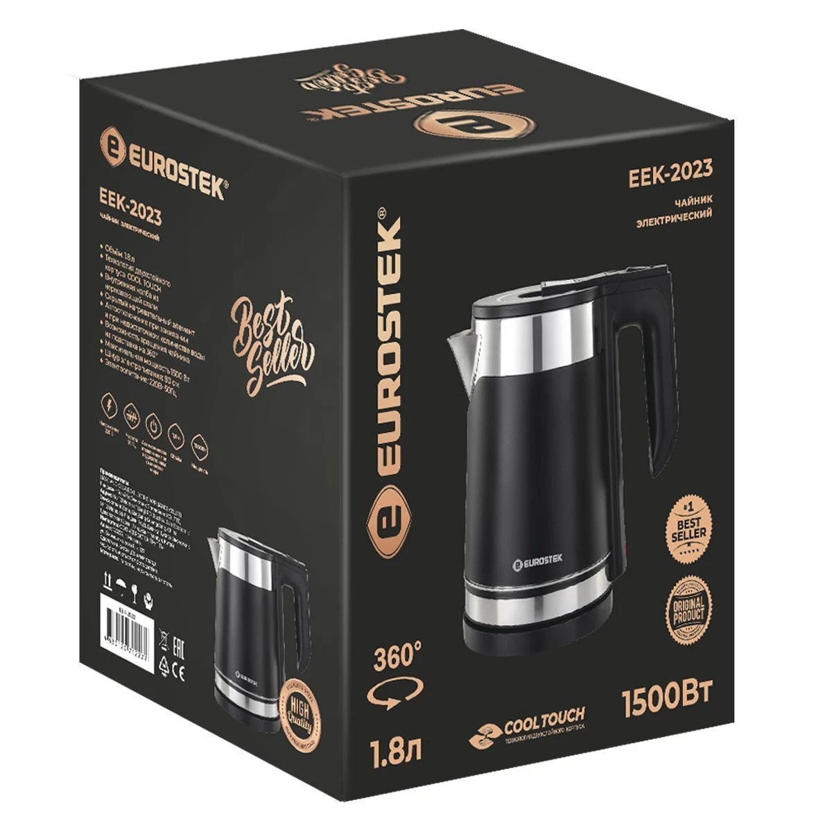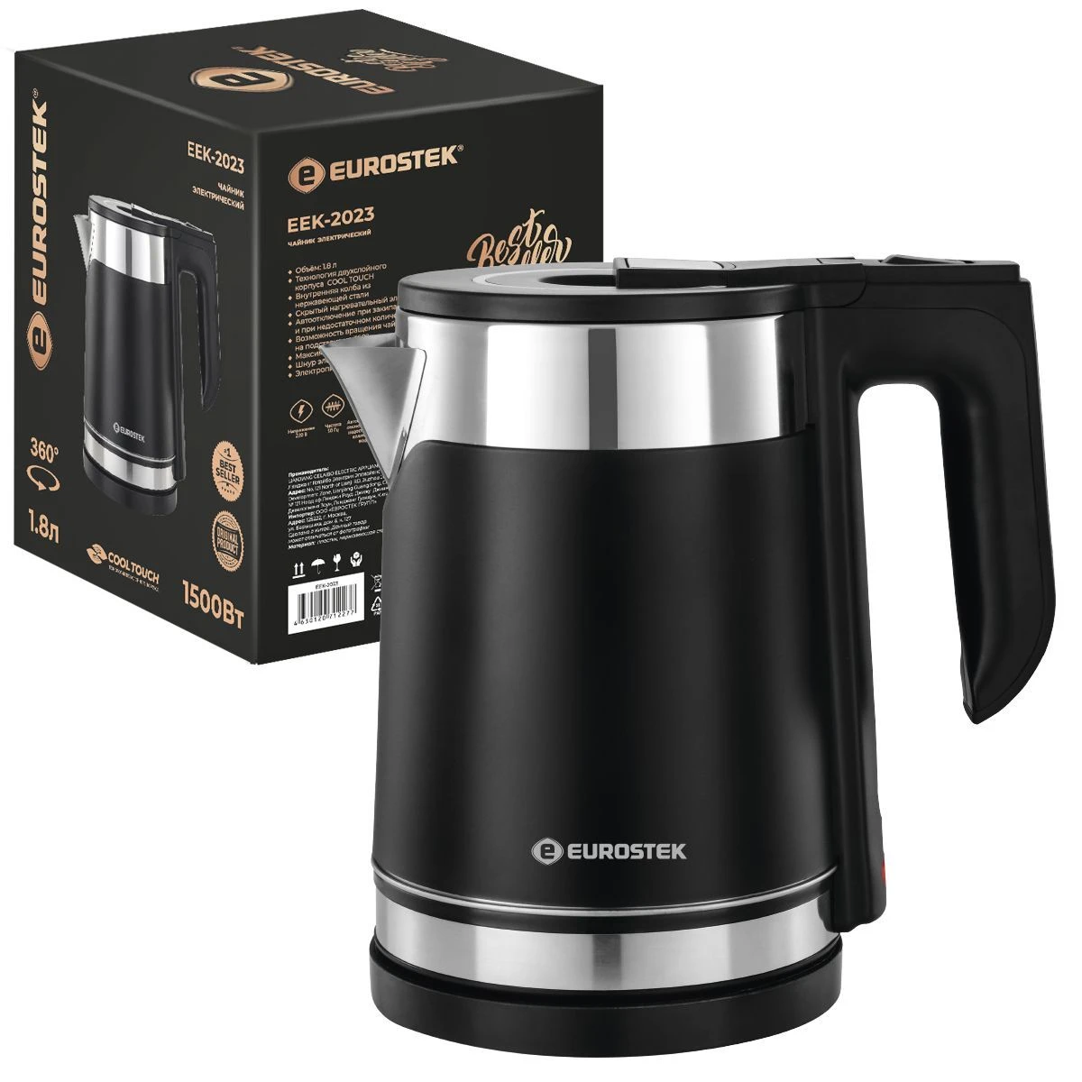 Чайник электрический «Eurostek» EEK-2023, 1500 Вт, Объем 1.8 л , Двойной корпус из нержавеющей стали и пластика, кнопка открывания крышки, шкала уровня воды, дисковый нагревательный элемент, световая индикация работы, вращения чайника на подставке на 360, автоматическое отключение при закипании и при недостаточном количестве воды.
