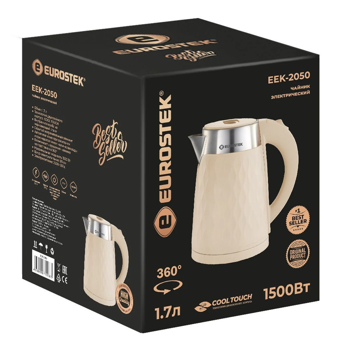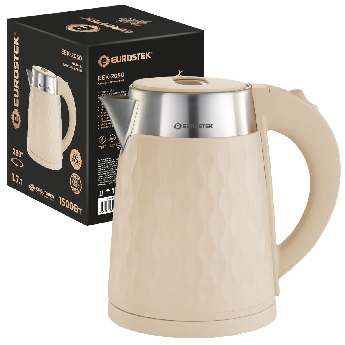 Чайник электрический «Eurostek» EEK-2050, 1500 Вт, Объем 1.7 л , Двойной корпус из нержавеющей стали и пластика, кнопка открывания крышки, шкала уровня воды, дисковый нагревательный элемент, световая индикация работы, вращения чайника на подставке на 360, автоматическое отключение при закипании и при недостаточном количестве воды.