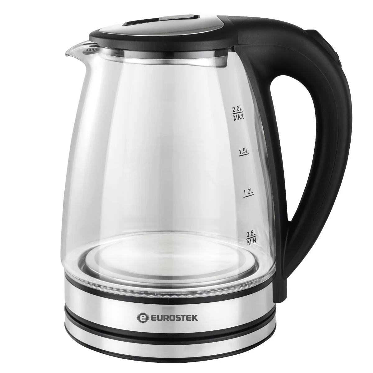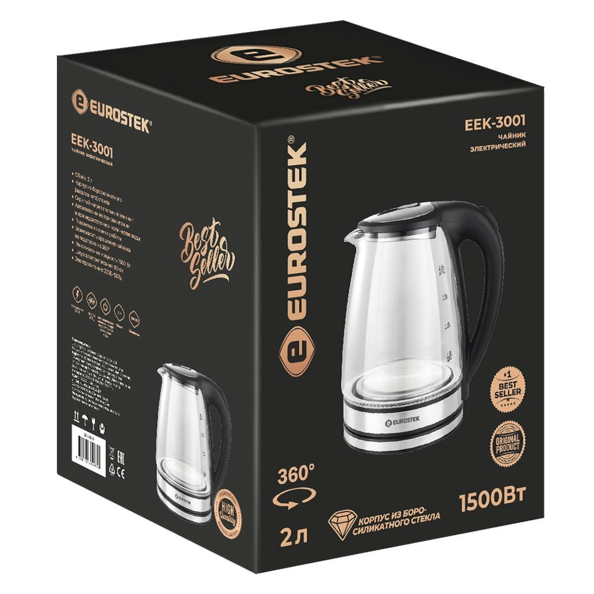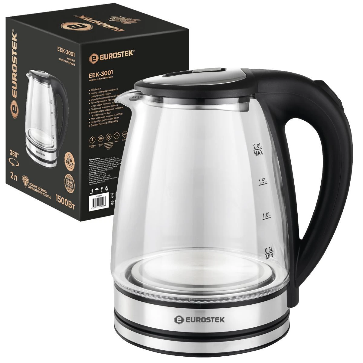 Чайник электрический «Eurostek» EEK-3001, 1500 Вт, Объем 2 л , Корпус из стекла, Шкала уровня воды. Дисковый нагревательный элемент из нержавеющей стали. Световая индикация работы. Возможность вращения чайника на подставке на 360, Автоматическое отключение при закипании и при недостаточном количестве воды.