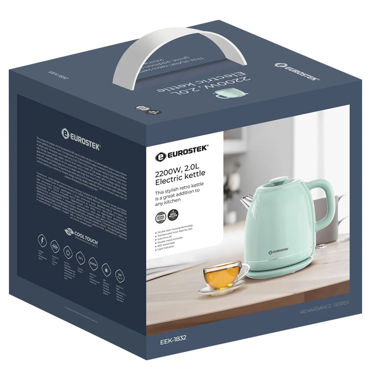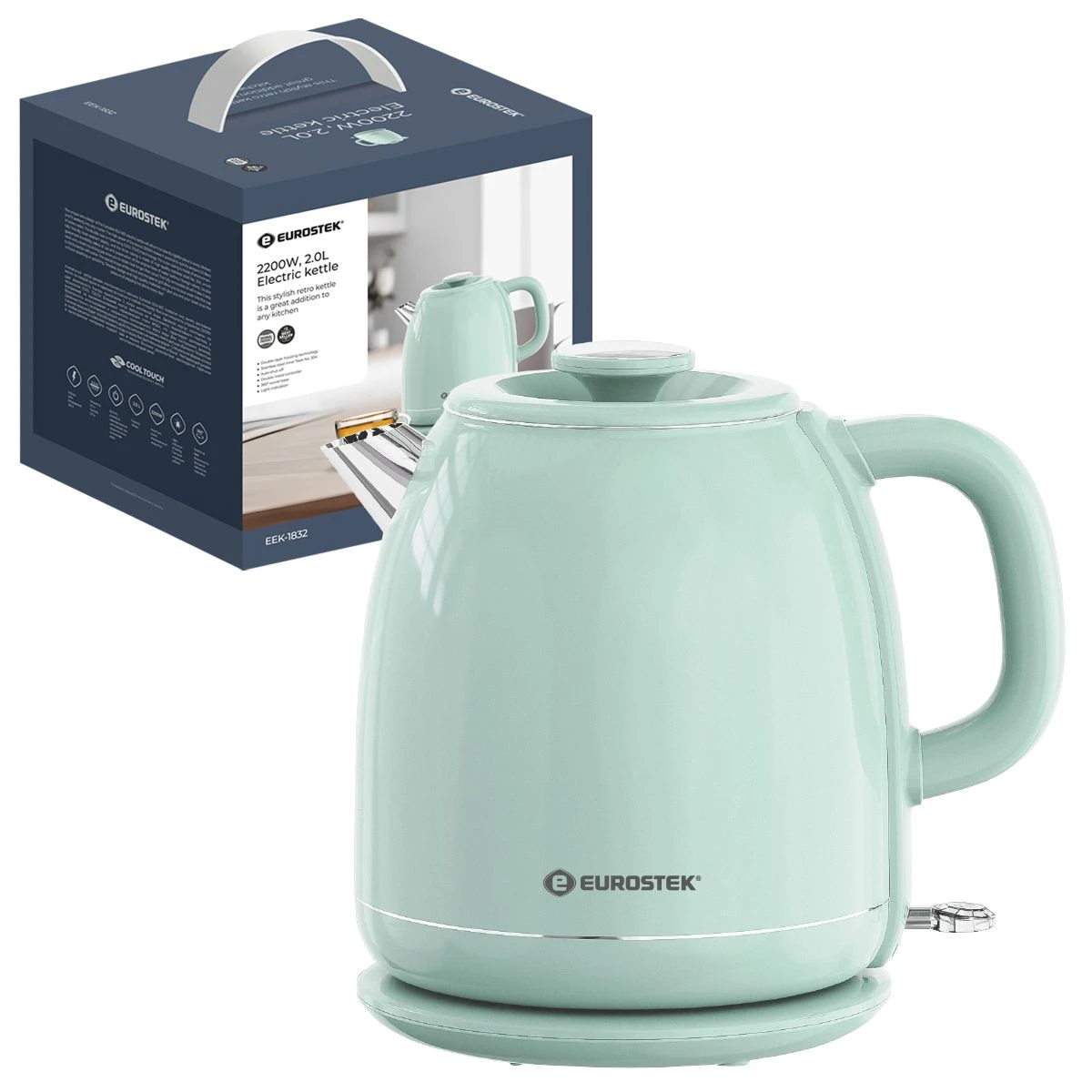 Объем 2,0 л , мощность: 2200 Вт, технология двухслойного корпуса COOL TOUCH, дисковый нагревательный элемент, длина шнура 0,9 м, световая индикация работы, вращения чайника на подставке на 360, автоматическое отключение при закипании и при недостаточном количестве воды.