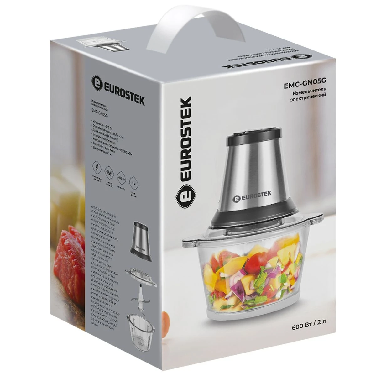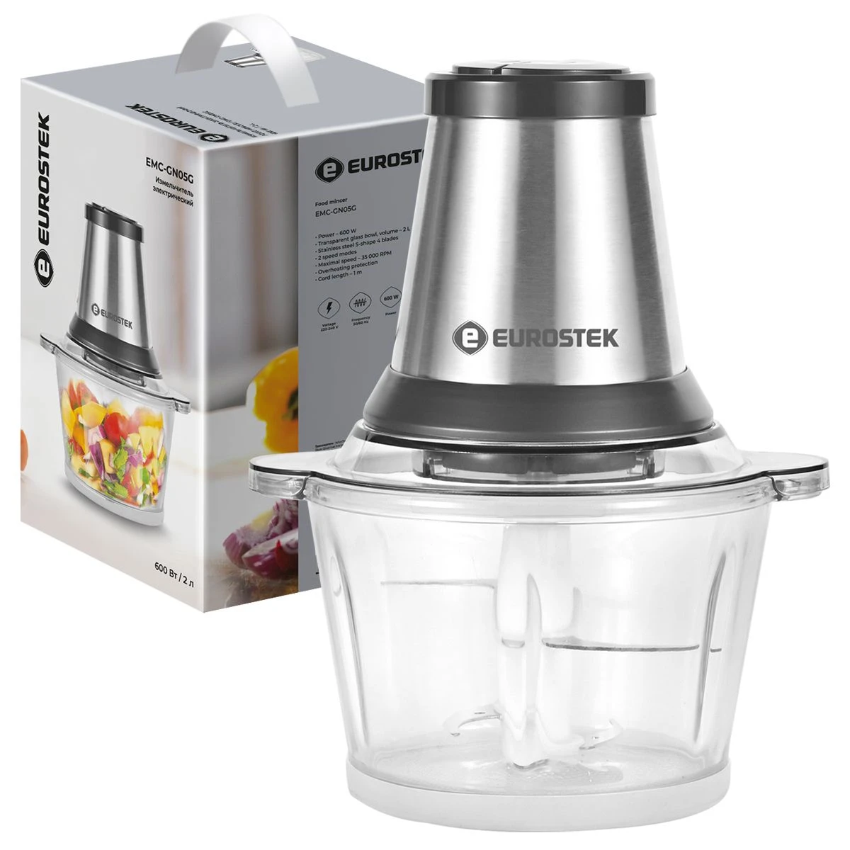 Измельчитель Eurostek EMC-GN05G, мощность 600 Вт, чаша объемом 2 л., стальной нож из 4 лезвий, 2 скорости