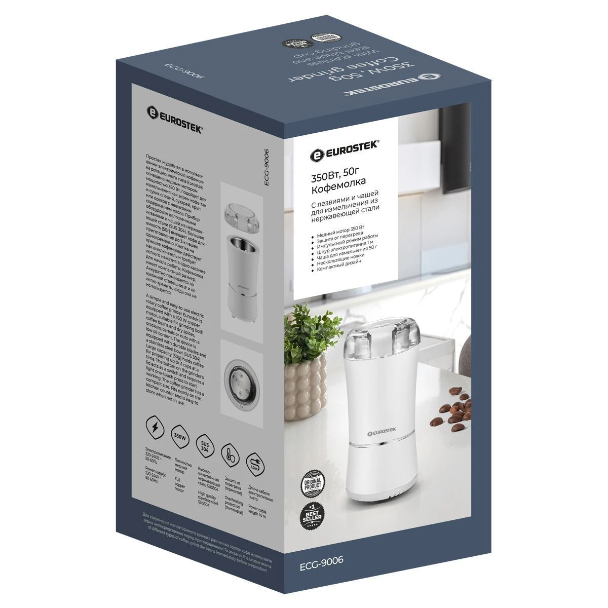 Кофемолка ECG-9006 проста и удобна в использовании. Подойдет для измельчения как зерен кофе так и сухих специй, сухарей, круп. мощность 350 Вт, объем 50 гр.
