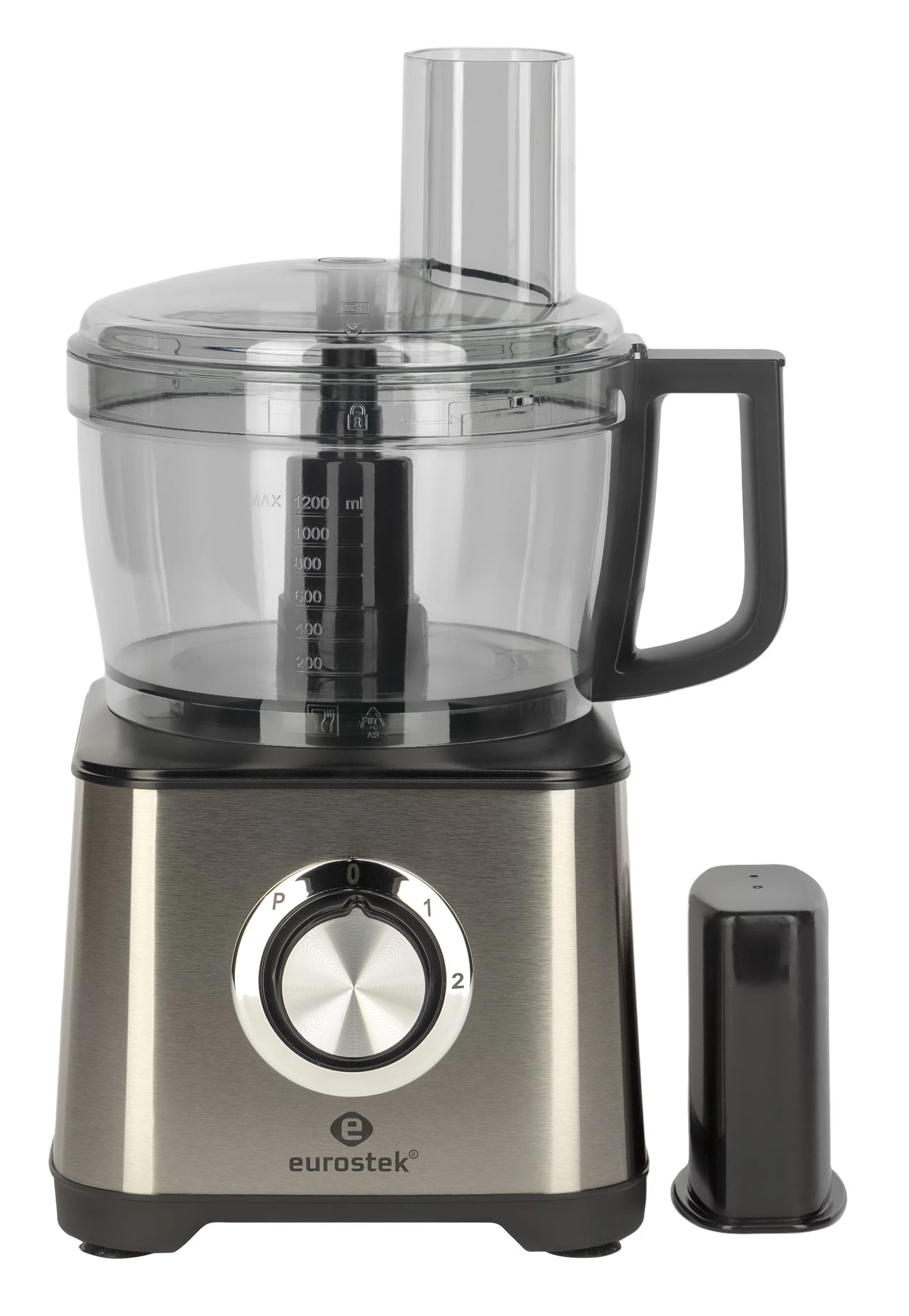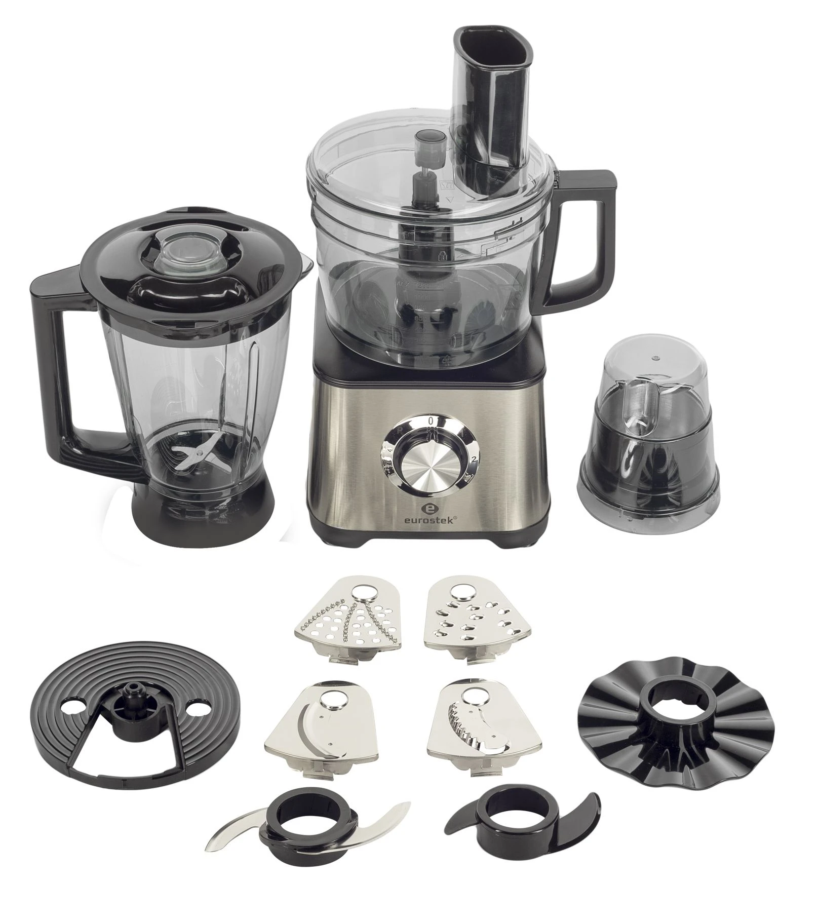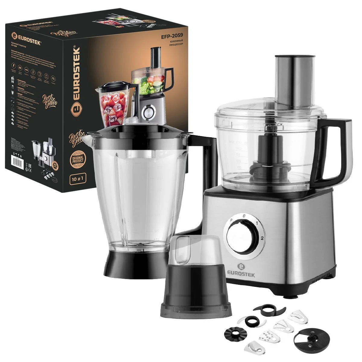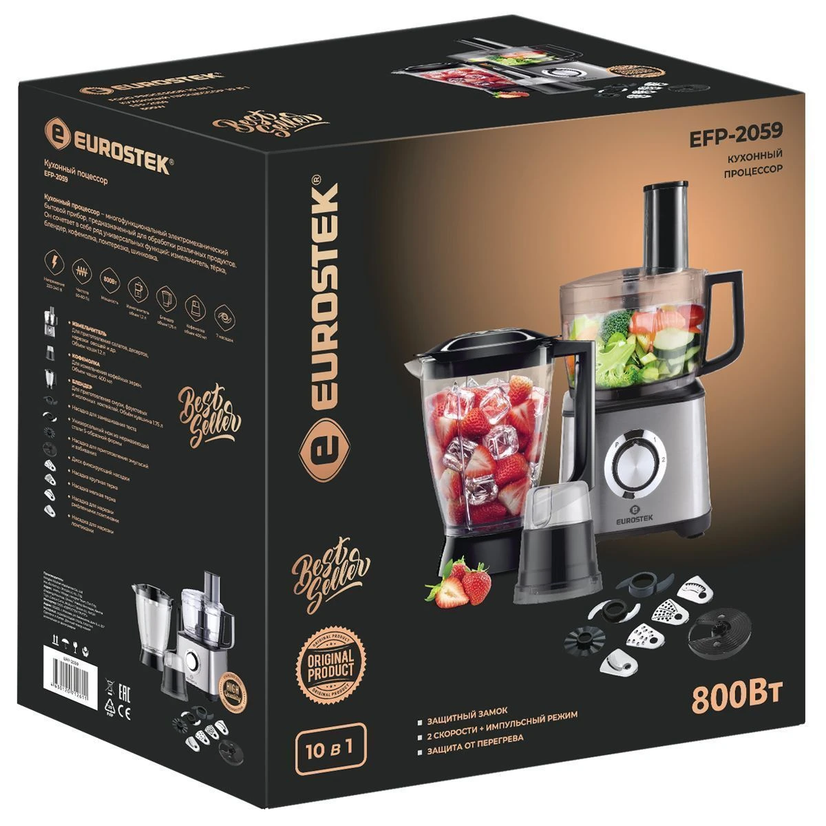 Кухонный комбайн "Eurostek" EFP-2059. Максимальная мощность 800Вт; металлический корпус, 2скорости + режим "Pulse"; измельчитель 1.2л., блендер 1.75л., кофемолка 0.4л. Стальные лезвия измельчителя; диски для размягчения, получения эмульсий. Нарезка тонкими ломтиками, шинковка, приготовление жульена, картофельная терка - с 4-мя вставками