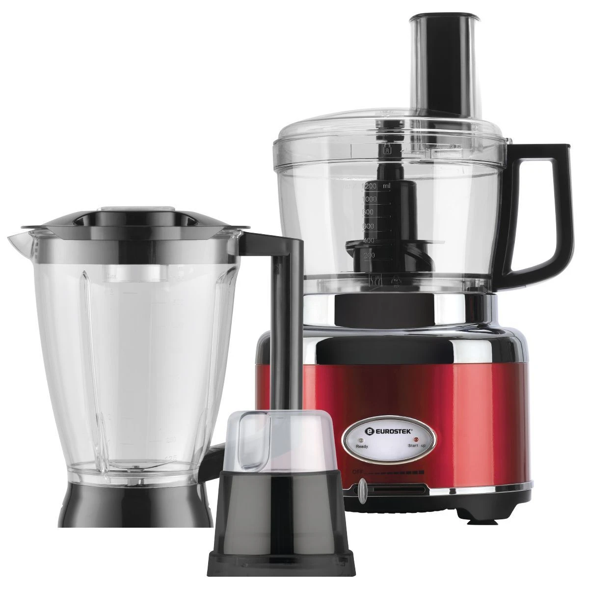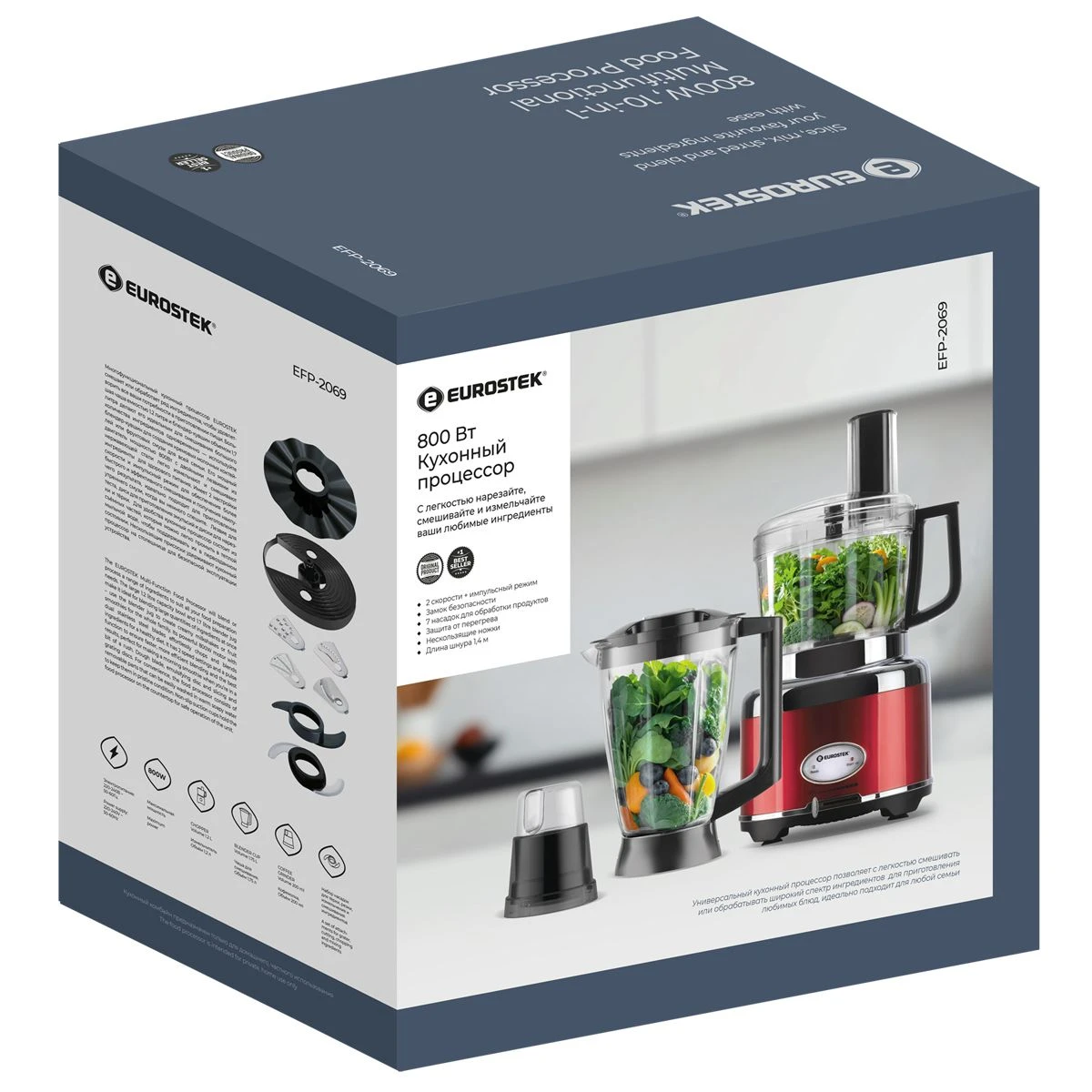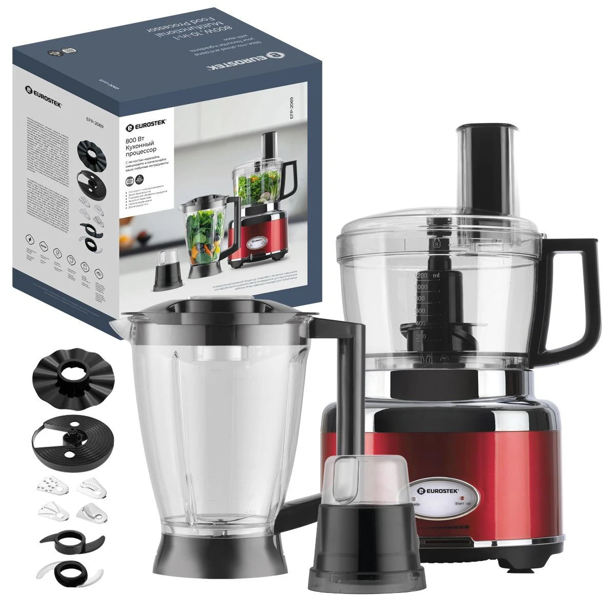 Кухонный комбайн "Eurostek" EFP-2069 Максимальная мощность 800Вт; металлический корпус, плавная регулировка скорости; измельчитель 1.2л., блендер 1.75л., кофемолка. Стальные лезвия измельчителя; диски для размягчения, получения эмульсий. Нарезка тонкими ломтиками, шинковка, приготовление жульена, картофельная терка - с 4-мя вставками