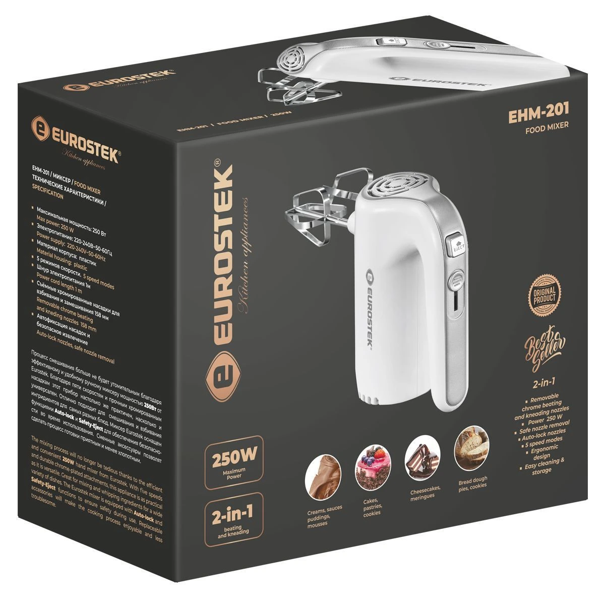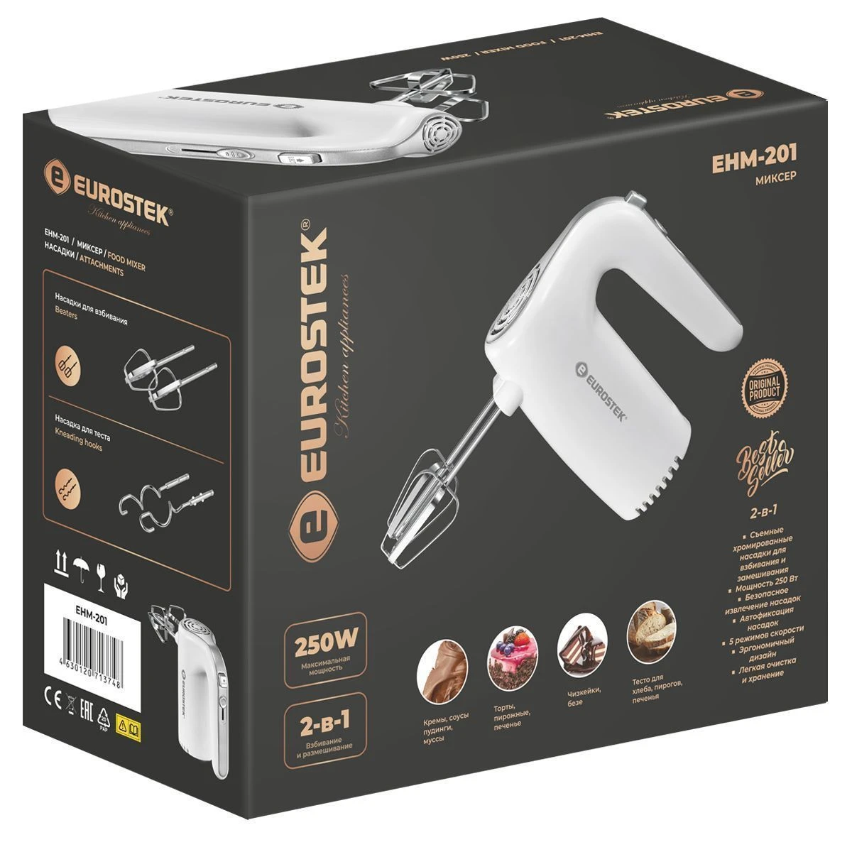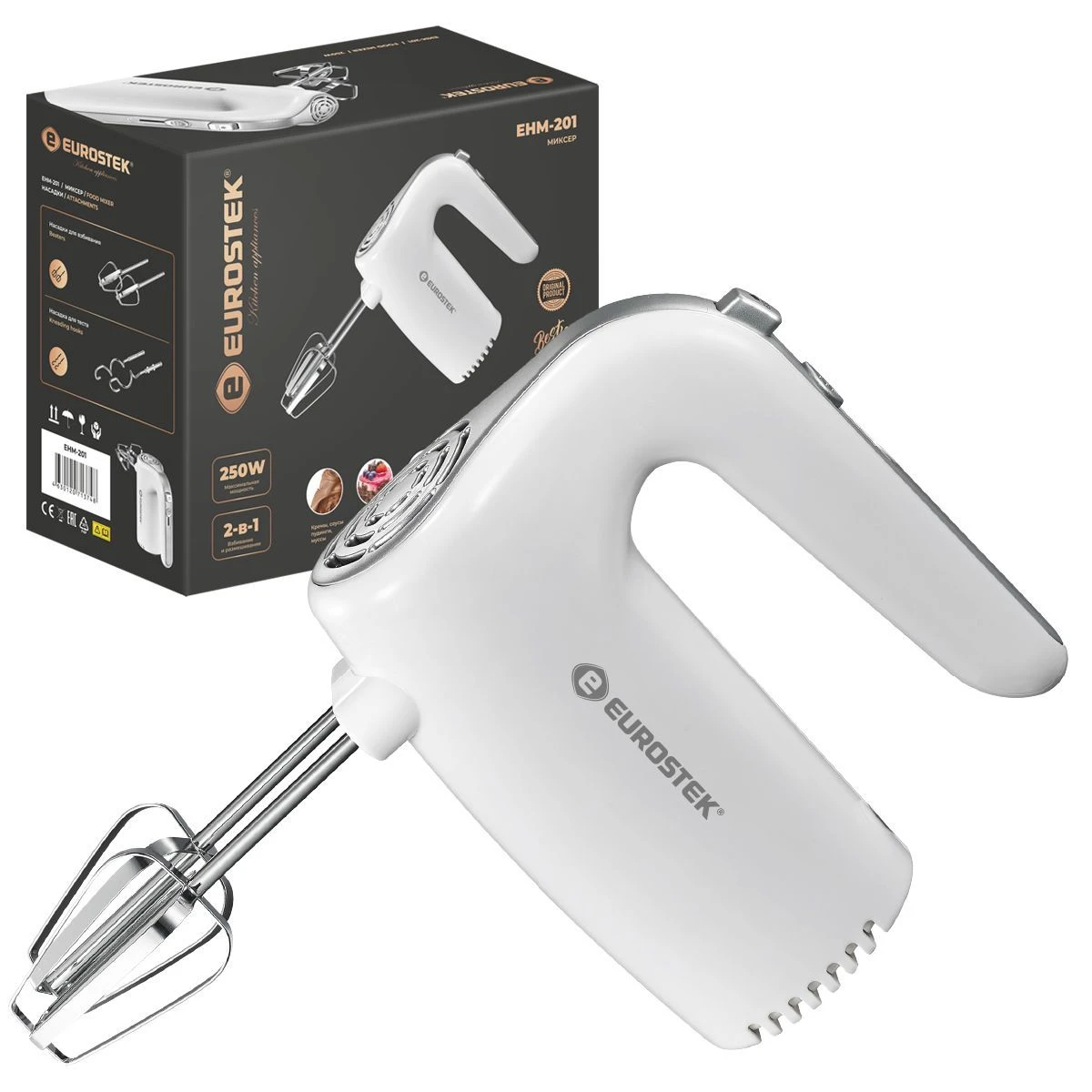 Миксер ручной Eurostek EHM-201. Мощность 250 Вт, 5 скоростей, 2 насадки для замешивания теста, насадки для взбивания, эргономичный дизайн.