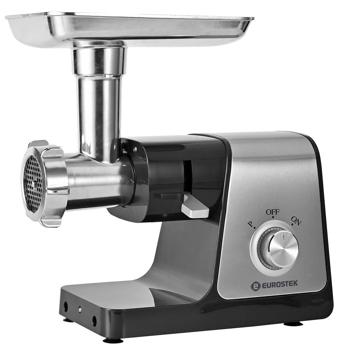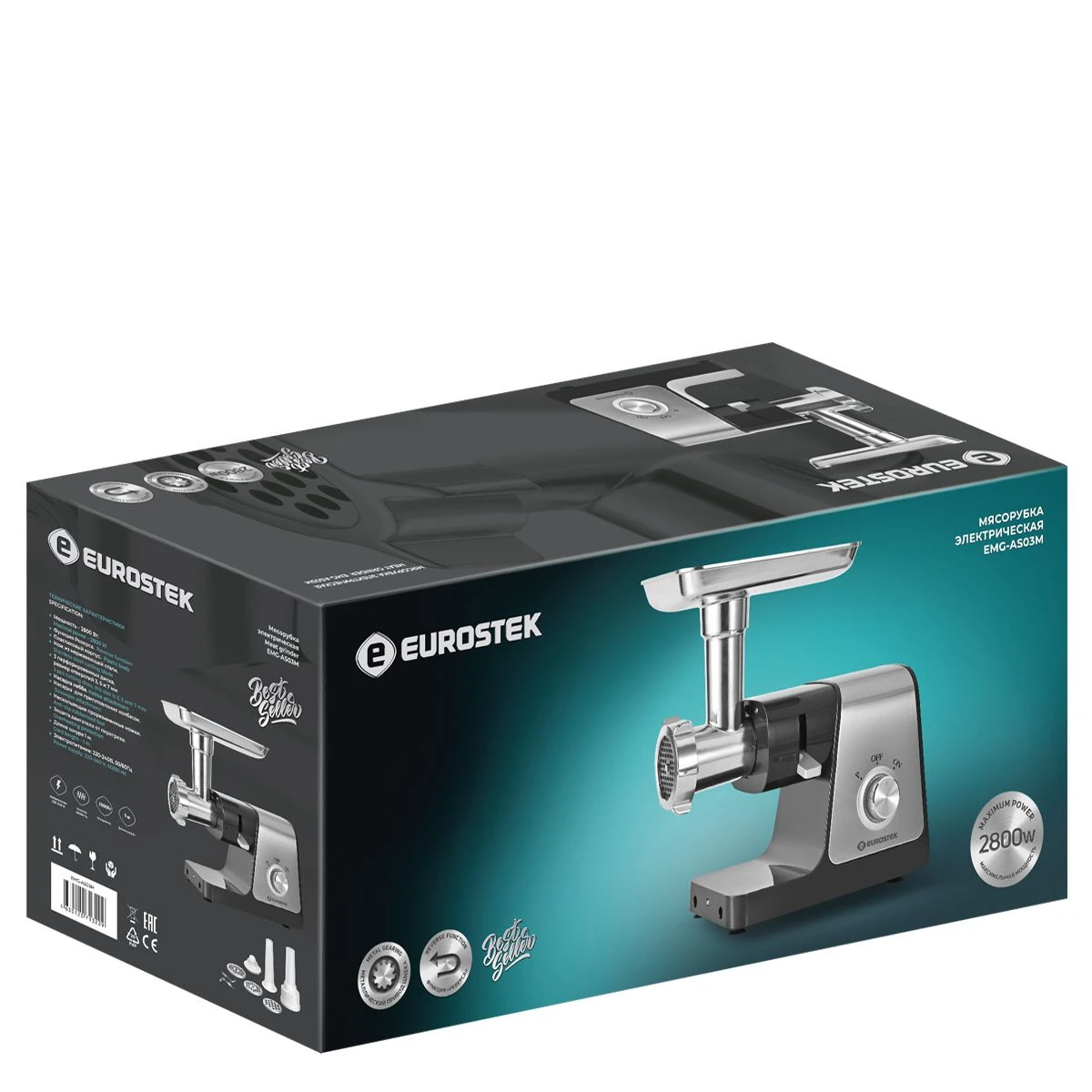 Мясорубка электрическая Eurostek EMG-AS03M. Мощность 2800 Вт, пластиковый корпус, функция Реверс, нож и диски из нержавеющей стали, перфорированные диски для мяса, размер отверстий 3, 5, 7 мм, насадка Кеббе, насадка для приготовления колбасок, противоскользящие ножки, Защита двигателя от перегрузки, длина шнура 1м