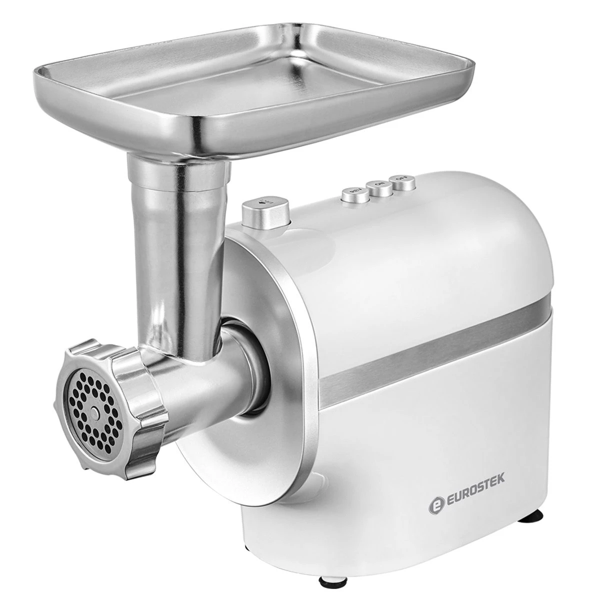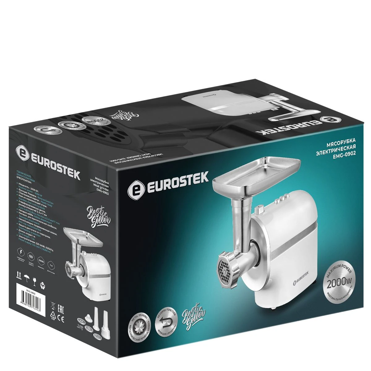 Мясорубка электрическая Eurostek EMG-0902. Мощность 2000Вт, пластиковый корпус, функция Реверс, нож и диски из нержавеющей стали, перфорированные диски для мяса, размер отверстий 3, 5, 7 мм, насадка Кеббе, насадка для приготовления колбасок, противоскользящие ножки, Защита двигателя от перегрузки, длина шнура 1м