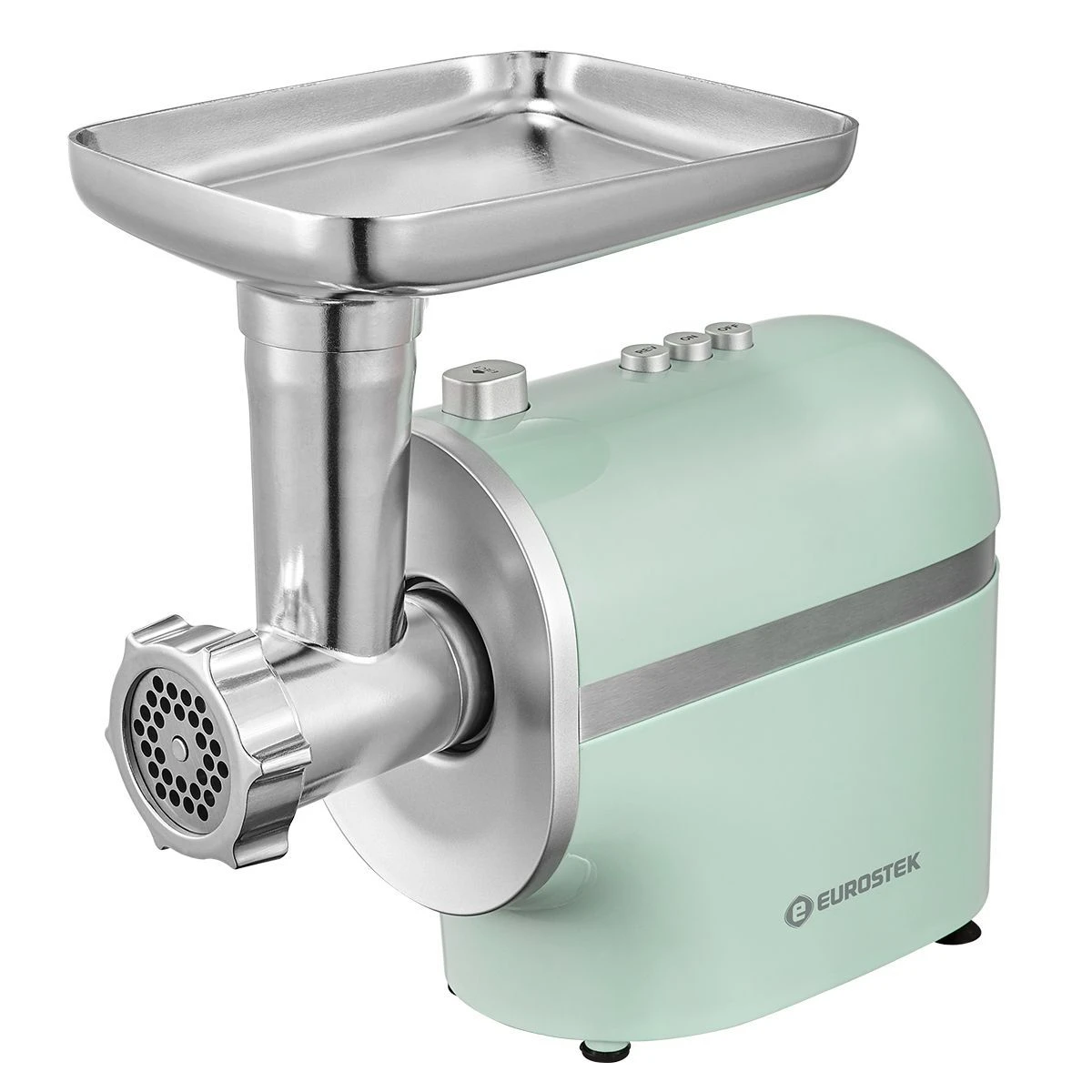 Мясорубка электрическая Eurostek EMG-0903. Мощность 2000Вт, пластиковый корпус, функция Реверс, нож и диски из нержавеющей стали, перфорированные диски для мяса, размер отверстий 3, 5, 7 мм, насадка Кеббе, насадка для приготовления колбасок, противоскользящие ножки, Защита двигателя от перегрузки, длина шнура 1м