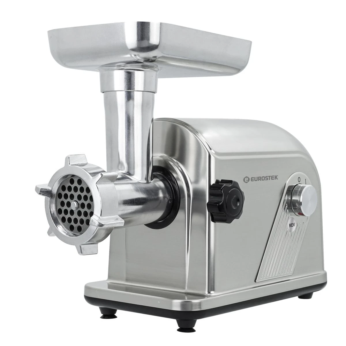 Мясорубка электрическая Eurostek EMG-0905. Мощность 3200Вт, пластиковый корпус, 2 скорости, функция Реверс, нож и диски из нержавеющей стали, перфорированные диски для мяса, размер отверстий 4, 7 мм, насадка Кеббе, насадка для приготовления колбасок, противоскользящие ножки, защита двигателя от перегрузки, длина шнура 1м