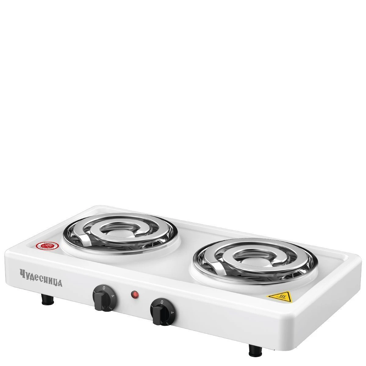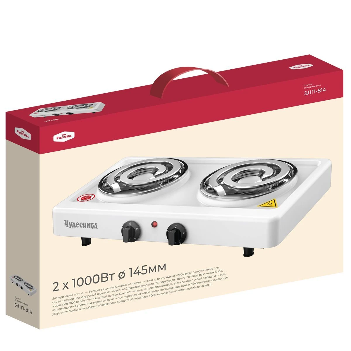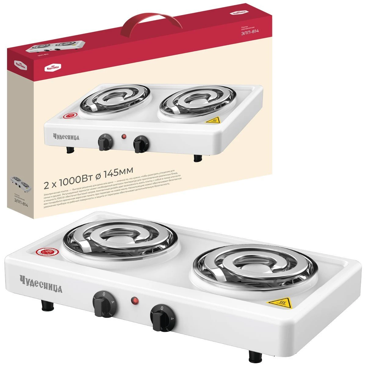 Плитка электрическая Чудесница ЭЛП-814 с 2-мя конфорками, цвет белый , мощность 1000+1000 Вт, спираль- нагревательный элемент, плавная регулировка температуры, прочное легкоочищаемое термостойкое эмалевое покрытие, защита от перегрева, световой индикатор работы