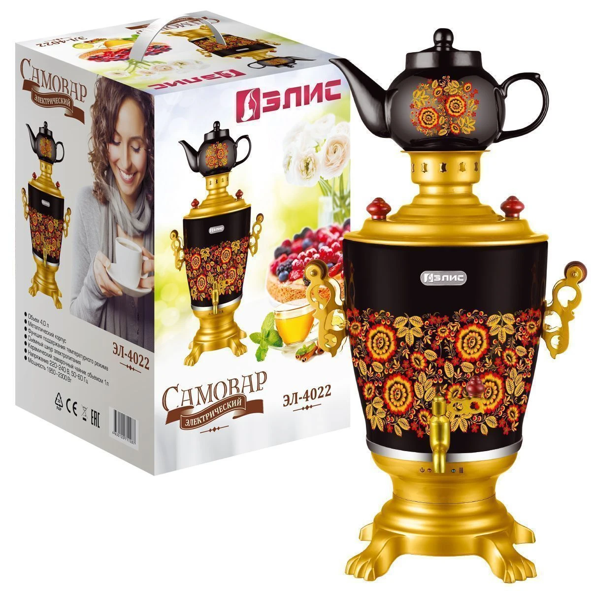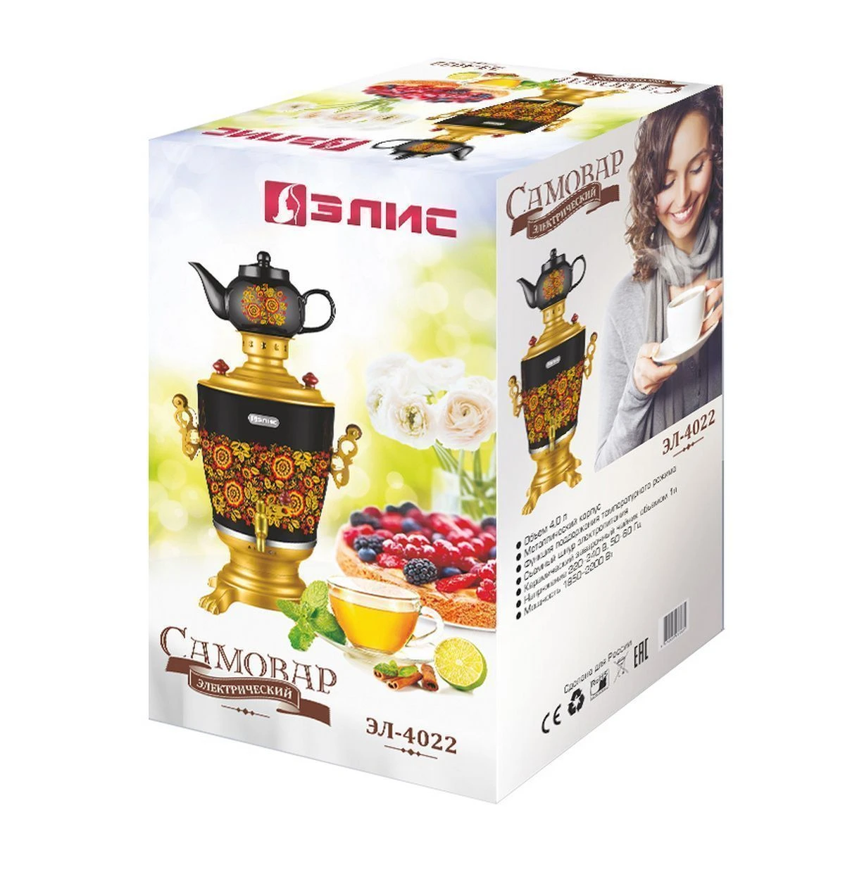 Электрический самовар "Элис" ЭЛ-4022. Мощность 1950-2300Вт, емкость, 4.0л, корпус из нержавеющей стали, съемный шнур, полированное покрытие корпуса, функция поддержания температурного режима, индикатор работы, дисковый нагревательный элемент, металлические ручки и краник, керамический заварной чайник 1.0л.