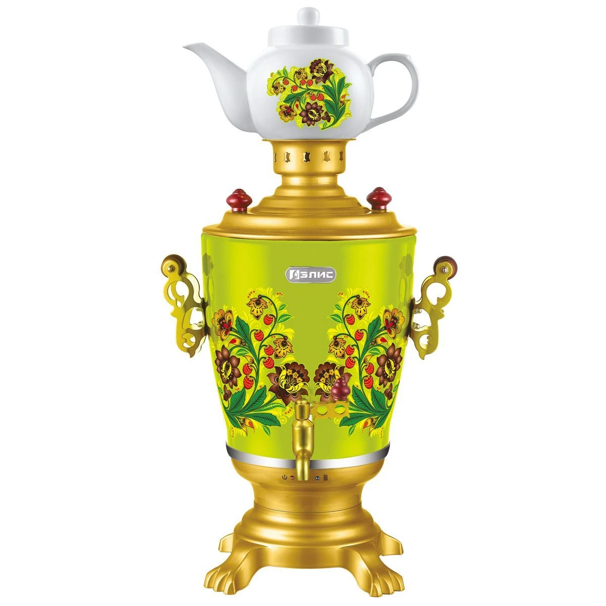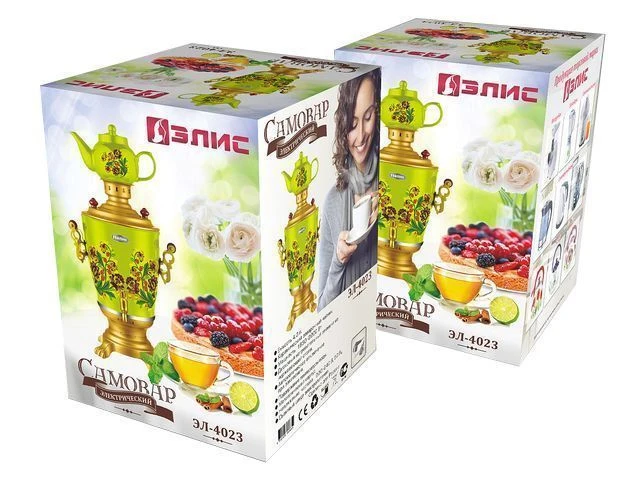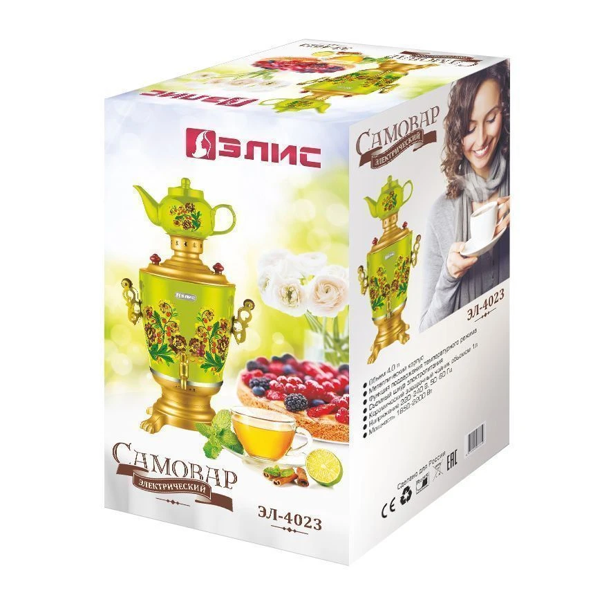 Электрический самовар "Элис" ЭЛ-4023. Мощность 1950-2300Вт, емкость, 4.0л, корпус из нержавеющей стали, съемный шнур, полированное покрытие корпуса, функция поддержания температурного режима, индикатор работы, дисковый нагревательный элемент, металлические ручки и краник, керамический заварной чайник 1.0л.