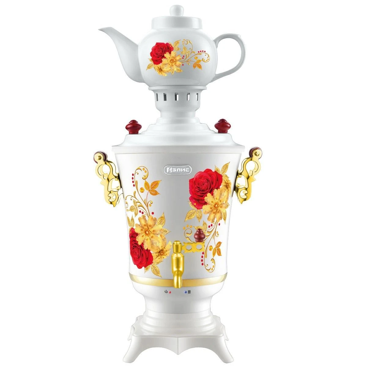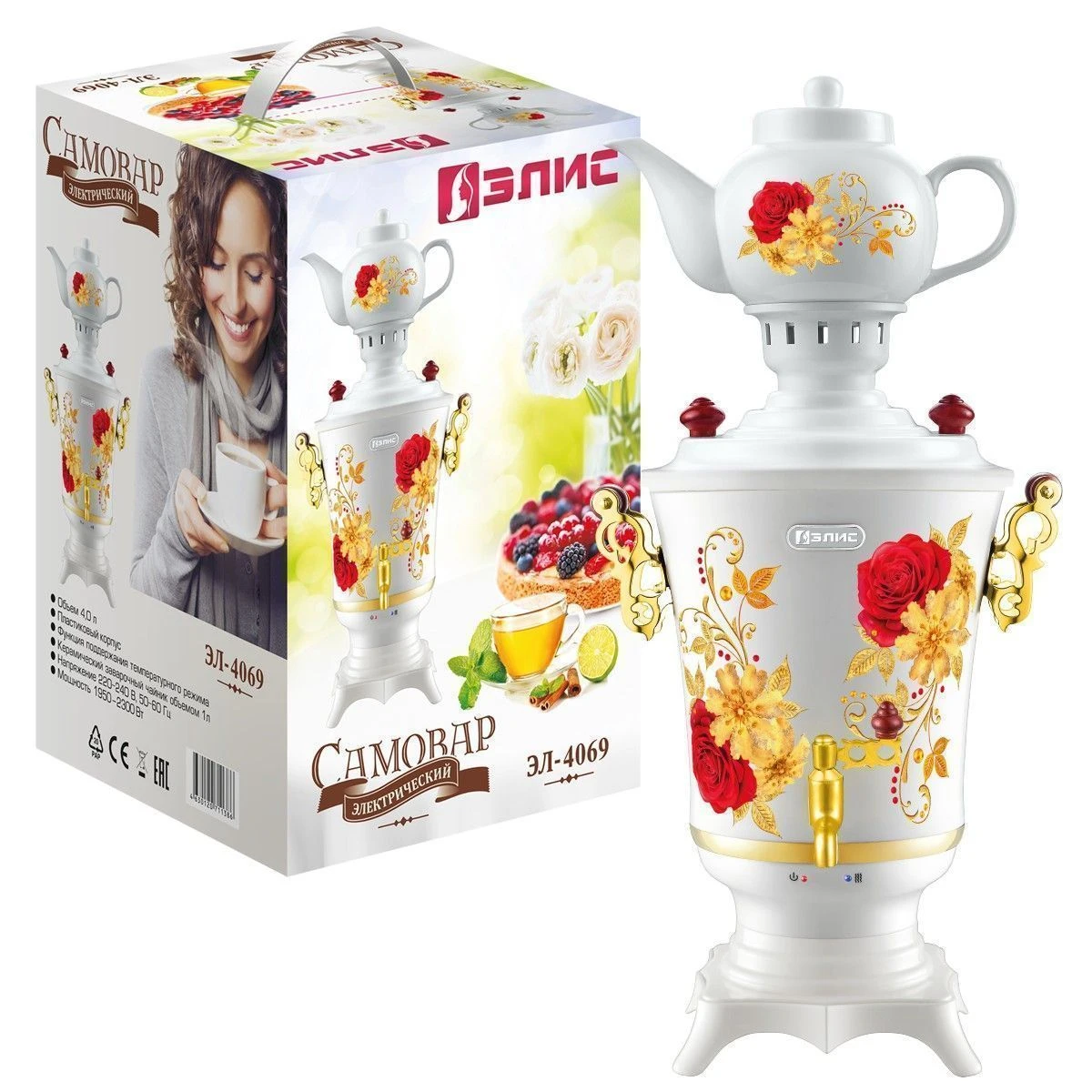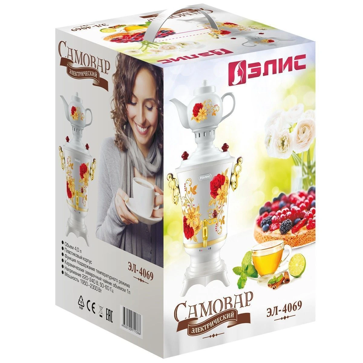 Электрический самовар "Элис" ЭЛ-4069, мощность 1950-2300Вт, емкость, 4.0л, корпус из пластика, полированное покрытие корпуса, функция поддержания температурного режима, индикатор работы, дисковый нагревательный элемент, металлические ручки и краник, керамический заварной чайник 1.0л)