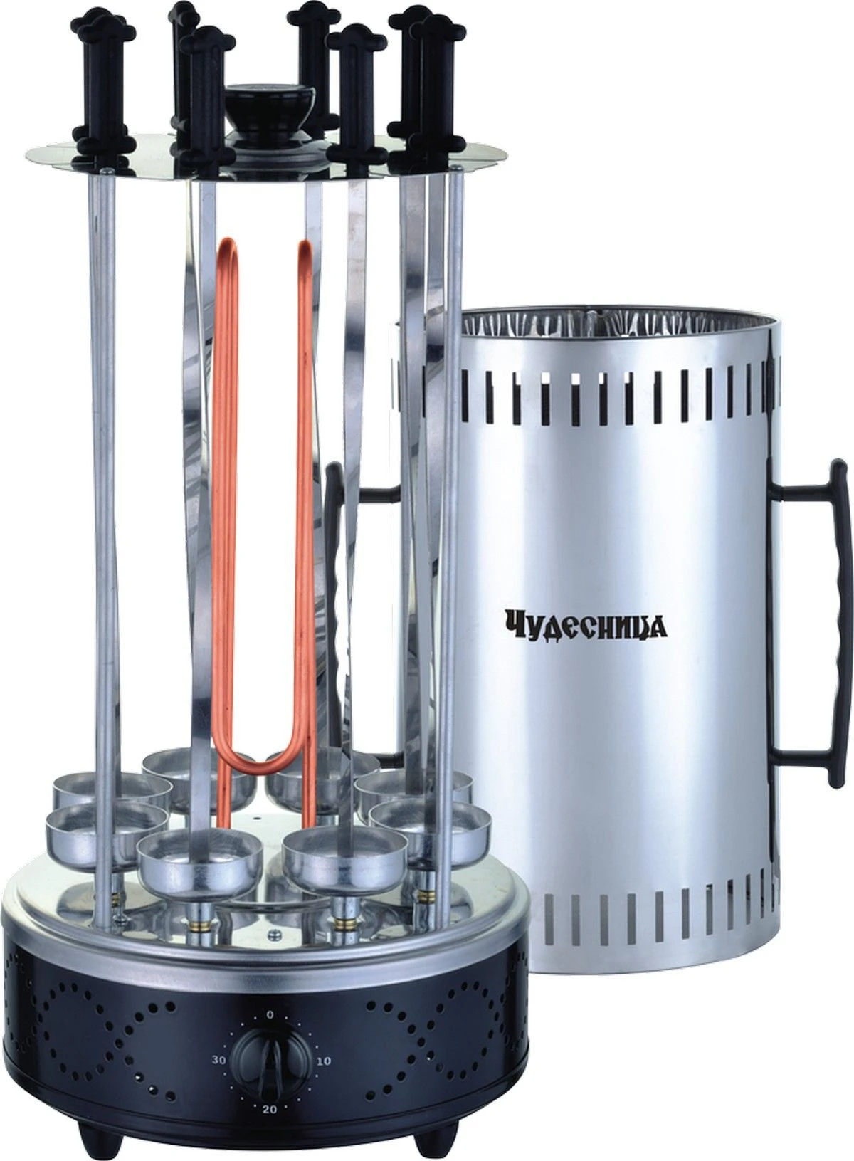 Электрошашлычница Чудесница ЭШ-1008T. Мощность: 1450Вт, 8 шампуров, кожух из нержавеющей стали, ТЭНовый нагревательный элемент, фиксаторы для шампуров.