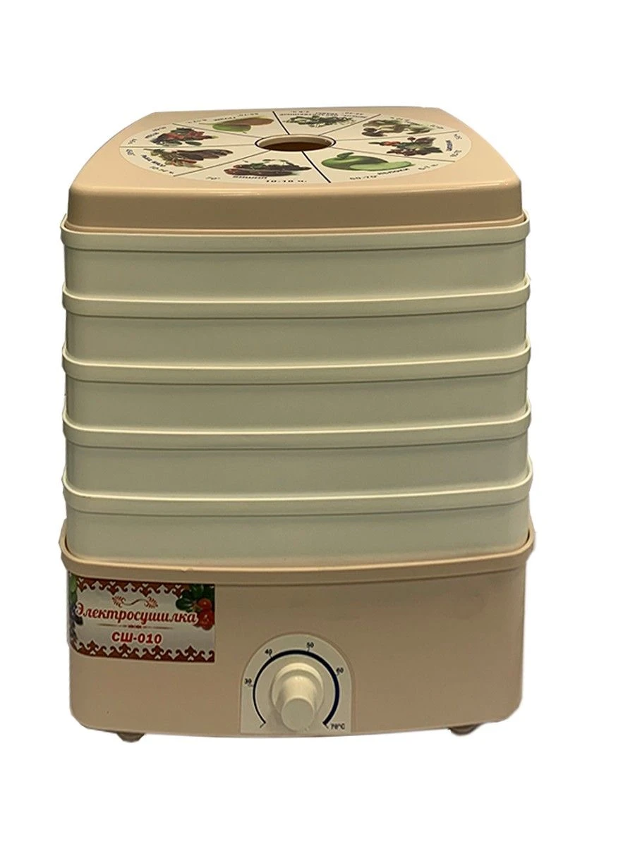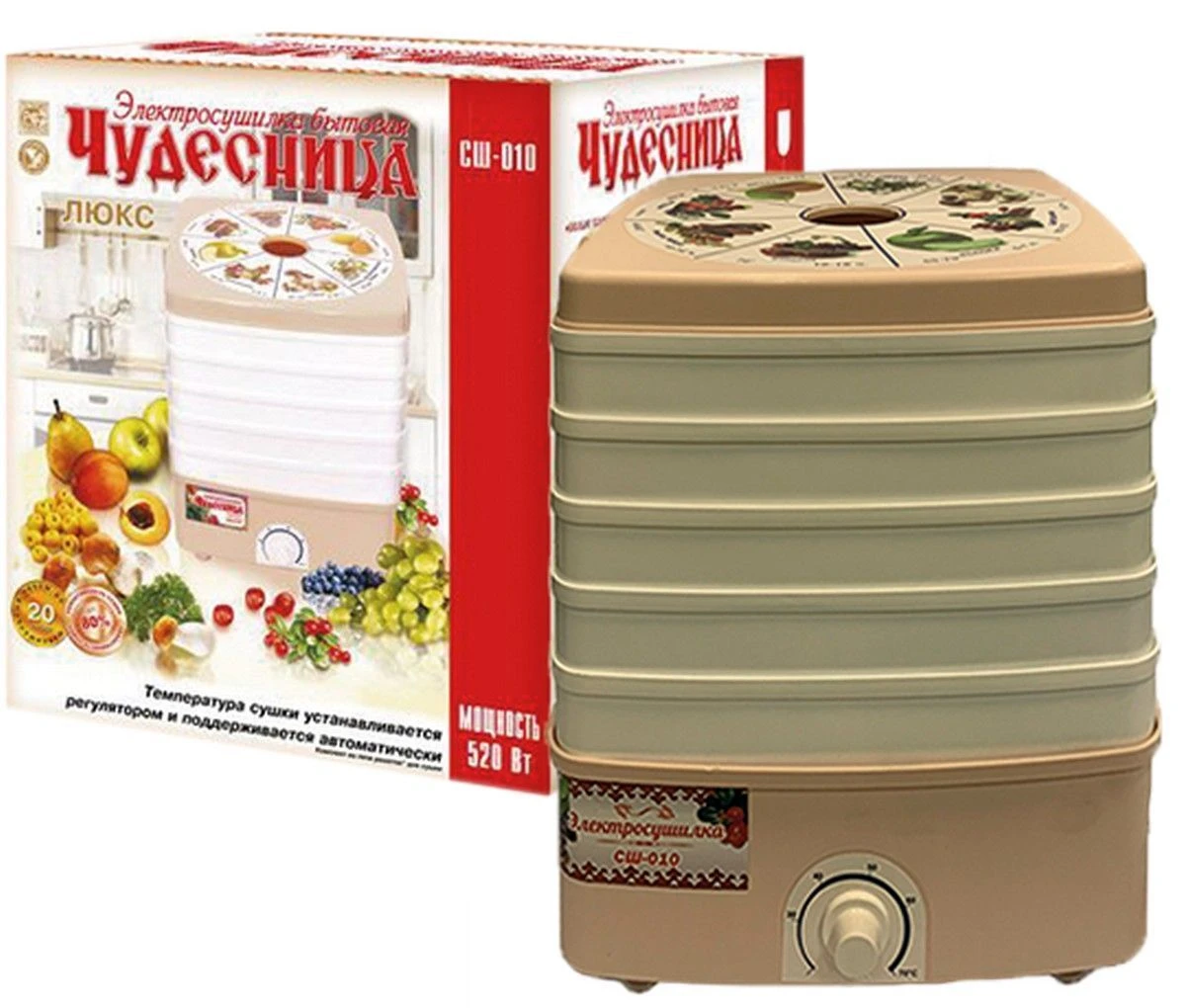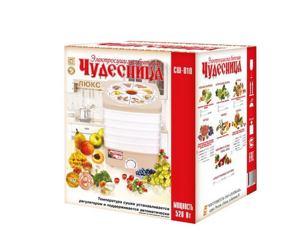 Электросушилка СШ-010 "Чудесница-Люкс" в цветной упаковке 5 решеток, мощность 520Вт, корпус пластик, объем 20 л, максимальная температура - 70С, терморегулятор, цветная упаковка.