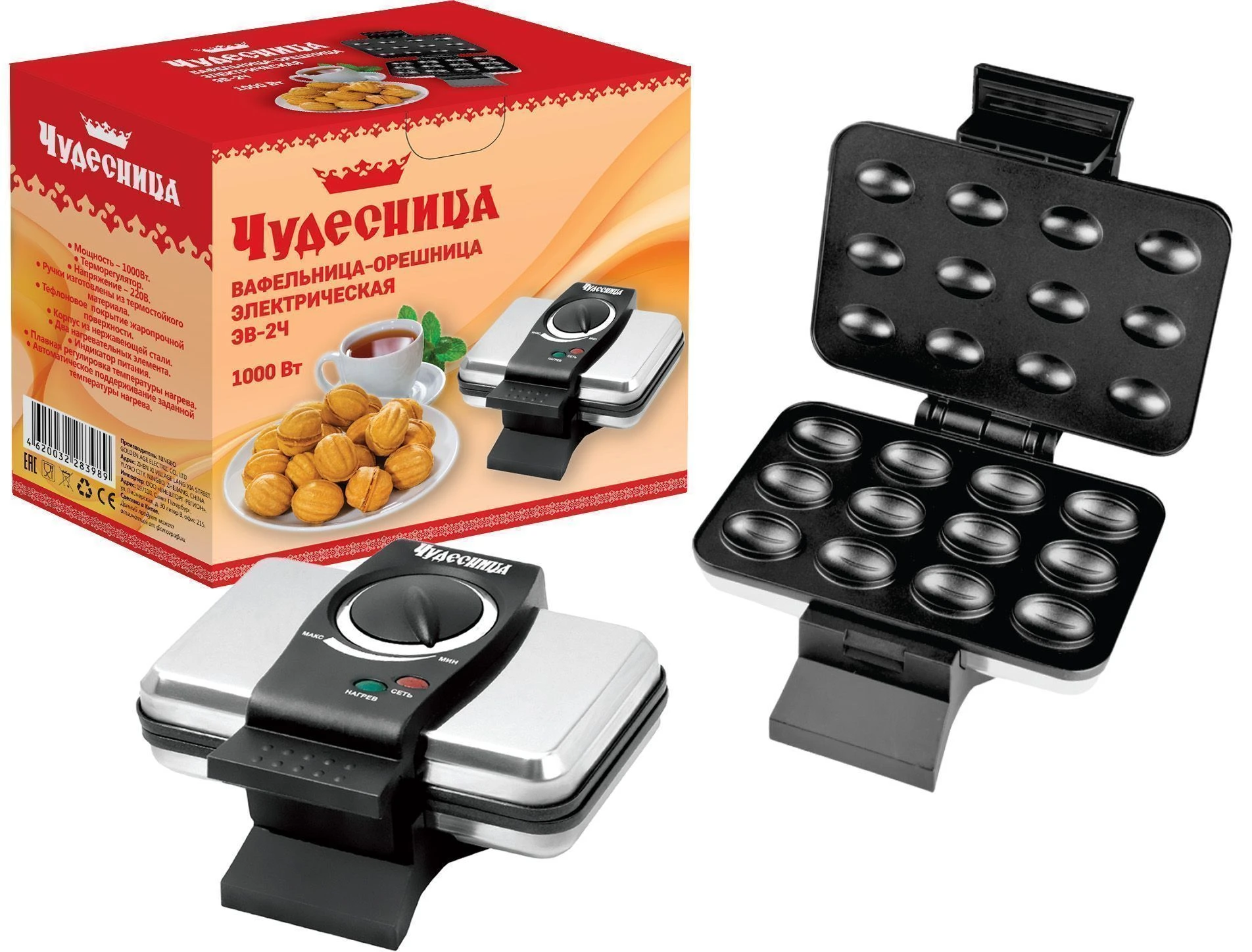Вафельница-орешница электрическая "Чудесница" ЭВ-2Ч. Мощность 1000Вт, 12 полуформ орешниц, нержавеющий корпус, тефлоновое покрытие жаропрочной поверхности, автоматическое поддержание заданной температуры нагрева, индикатор питания.