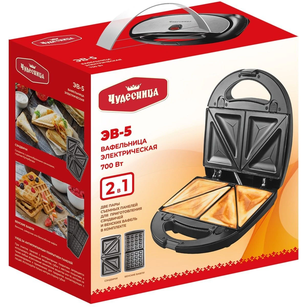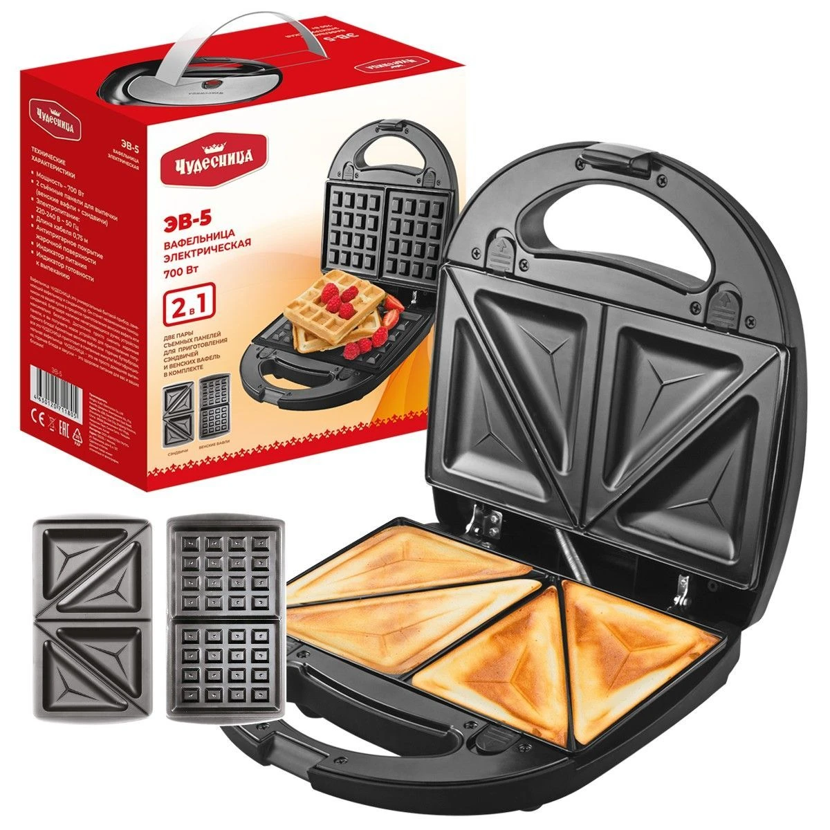 Мощность – 700 ВТ, 2 Съёмные панели для выпечки (венские вафли + сендвич), Длина кабеля 0,75м, Антипригарное покрытие с жаропрочной поверхностью, Индикатор питания, Индикатор готовности к выпеканию, Автоматическое поддержание заданной температуры нагрева